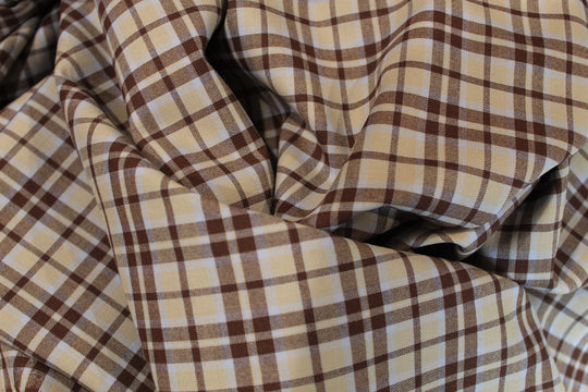 Lightweight brown plaid with pale blue highlights fading into a tan center. Pendleton 100% wool direct from the store where the sheep fleece is sourced in the US. Brand new fabric. Sews beautifully, not scratchy, light-worsted...Regular price $12.97 -