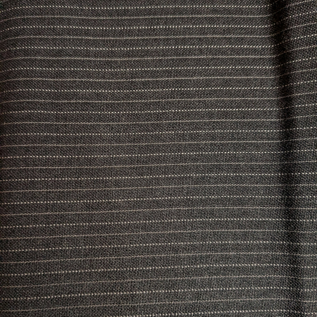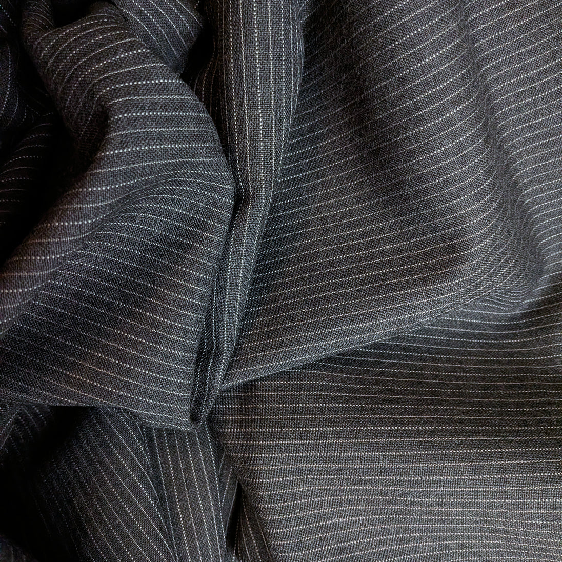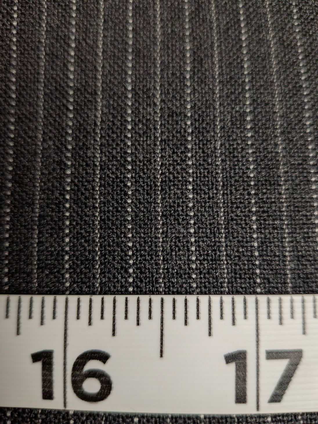 Flannel weight charcoal grey wool with a light gray chalk stripe on 1/8" repeat. This all wool fabric is new, off the bolt, and 58 inches wide. The material is made in England.