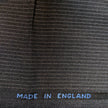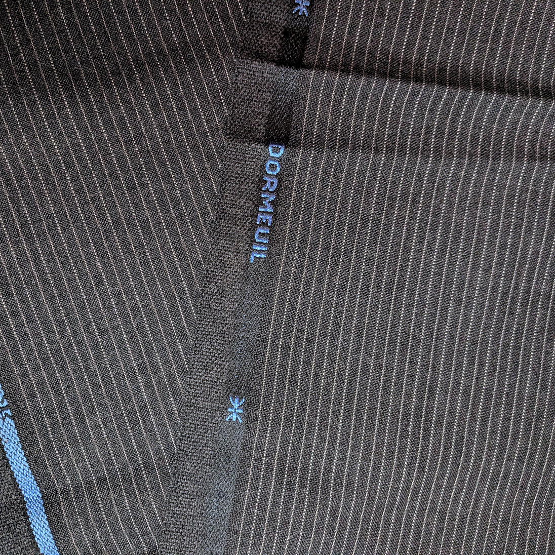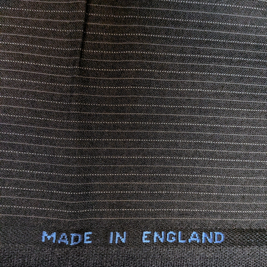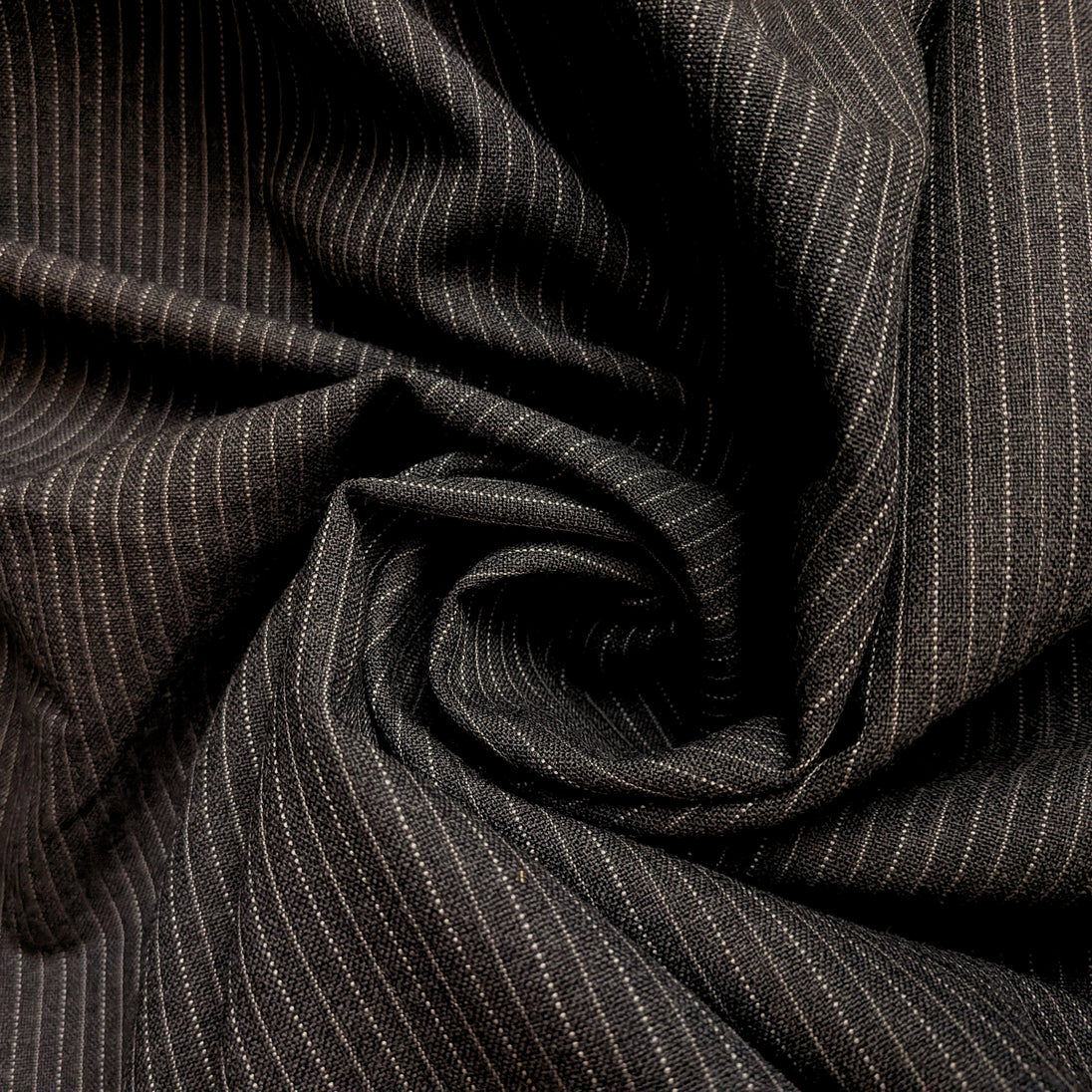 Flannel weight charcoal grey wool with a light gray chalk stripe on 1/8" repeat. This all wool fabric is new, off the bolt, and 58 inches wide. The material is made in England.