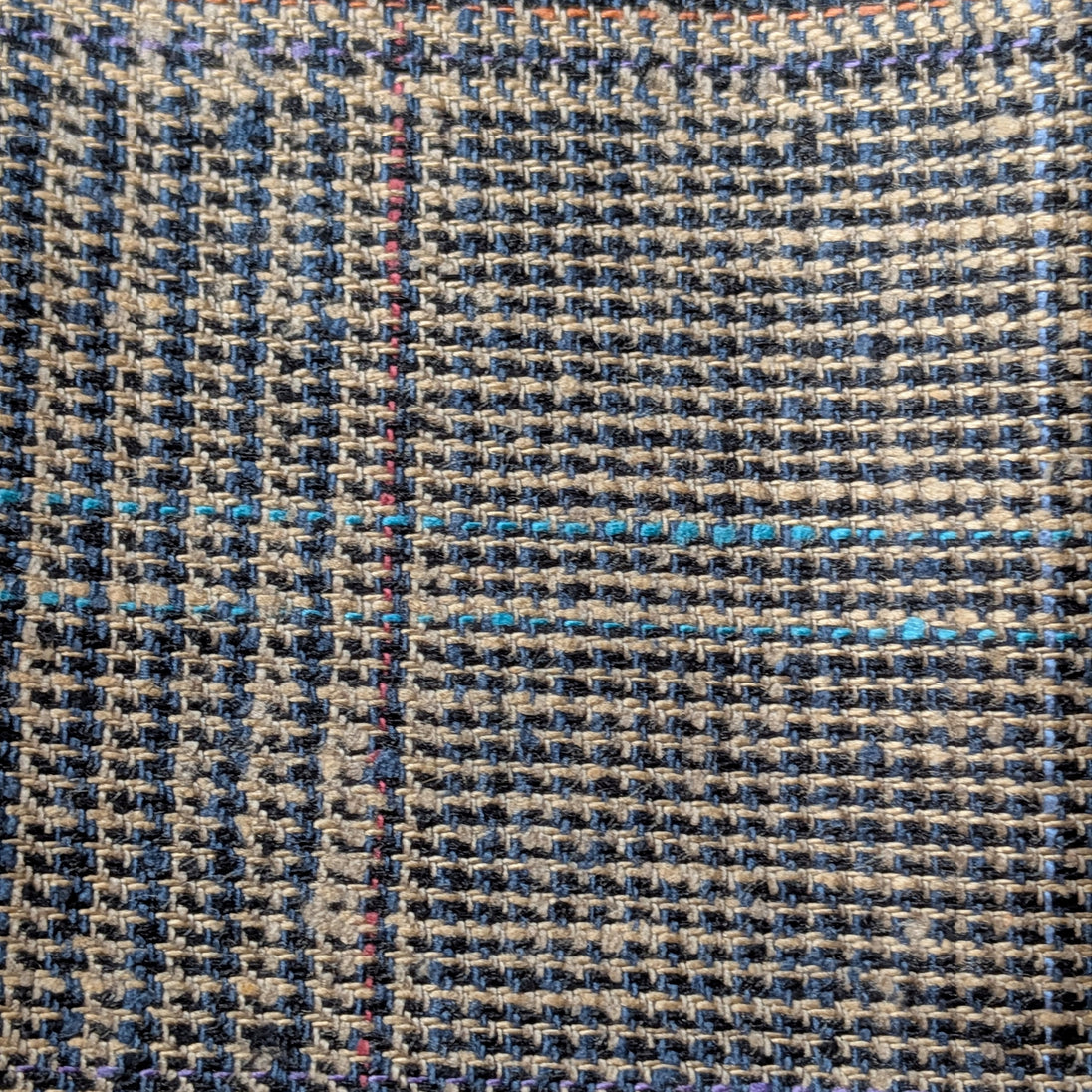 The plaid is composed of black and brown woven with lines of bright blue, purple, red, and other colored thread contrasts beautifully against the woven background, creating a subtle pattern. This distinct design complements any decor, adding a touch of elegance and warmth to your home or wardrobe.