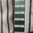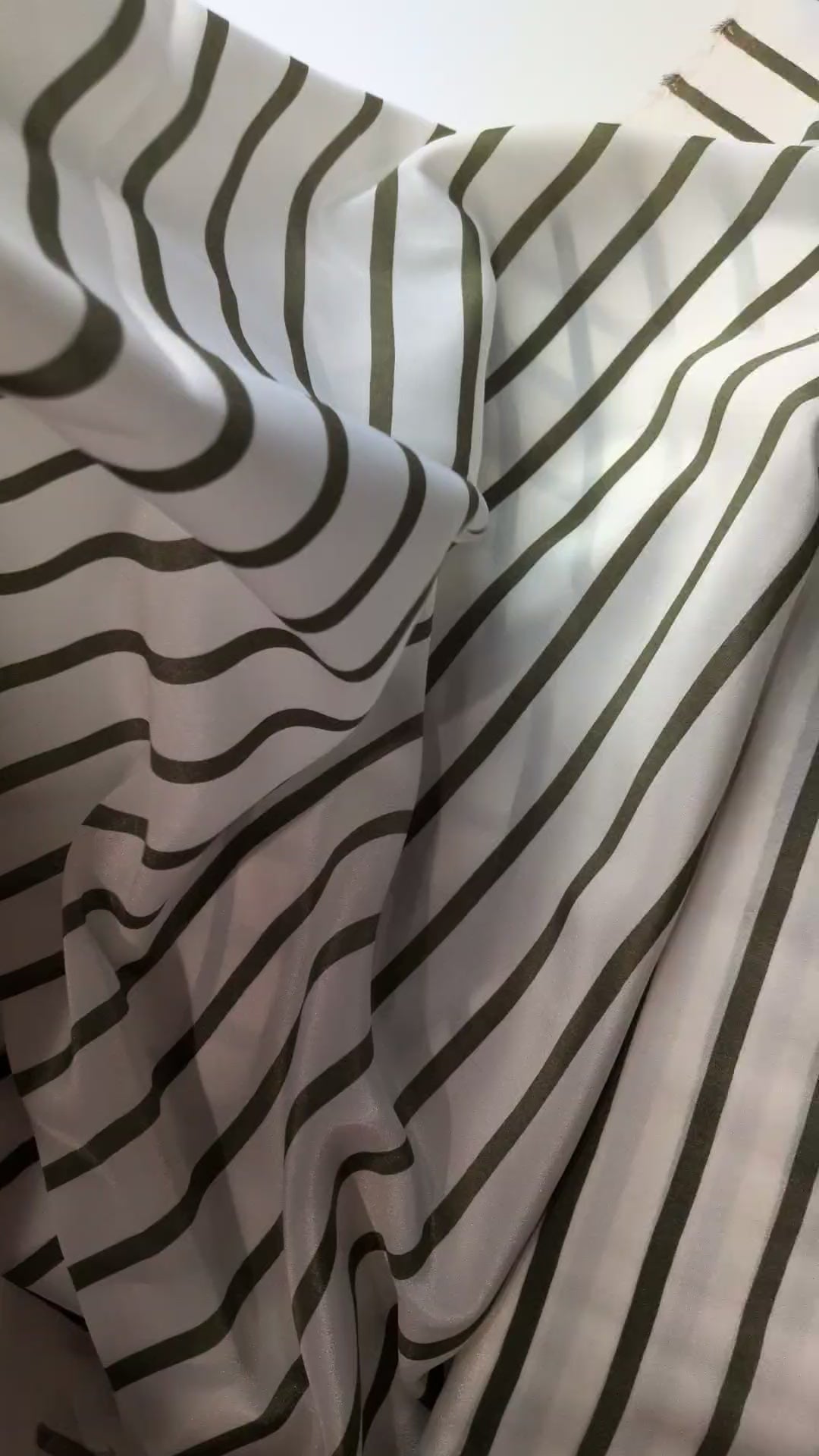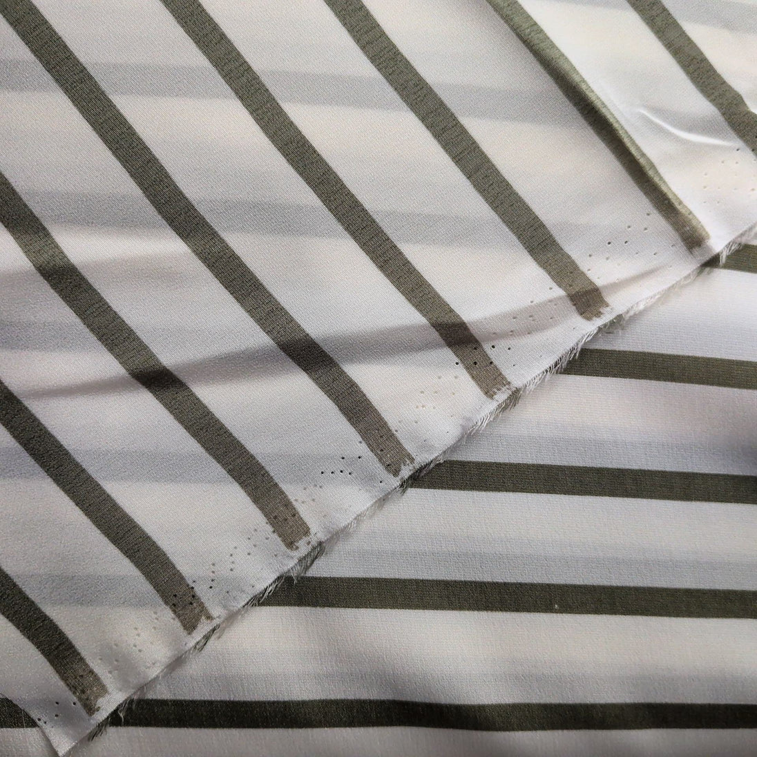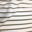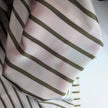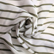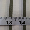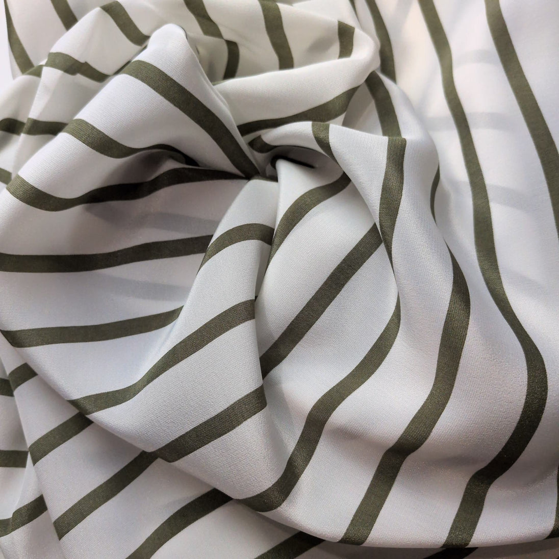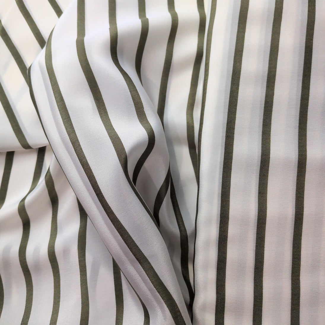 Lovely olive green and white fabric composed of silk and cotton, tightly woven with high thread count. Soft hand with a little bit of opaque body. It is 4 oz/yard. The pattern is a repeating thick 1/4" lines with a 1 1/8" repeat on a white background.