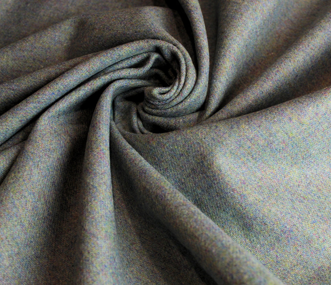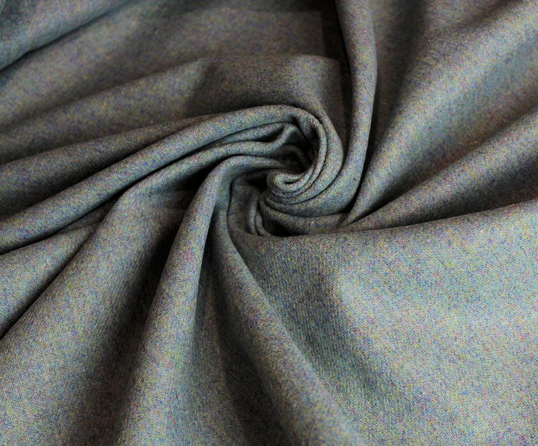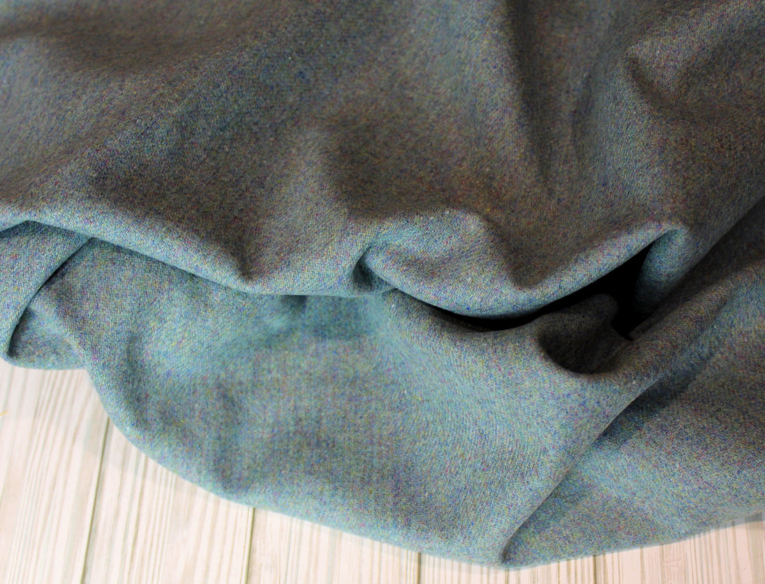 Dress-weight double-sided heather blue fabric with a heather mix of colors. Perfect match for a range of colors. Brand new fabric, cut to order in a continuous piece. Soft to the touch. Flannel weight at 12 oz/yard and tightly woven. For sale by the yard. 70% wool and 30% nylon blend.