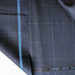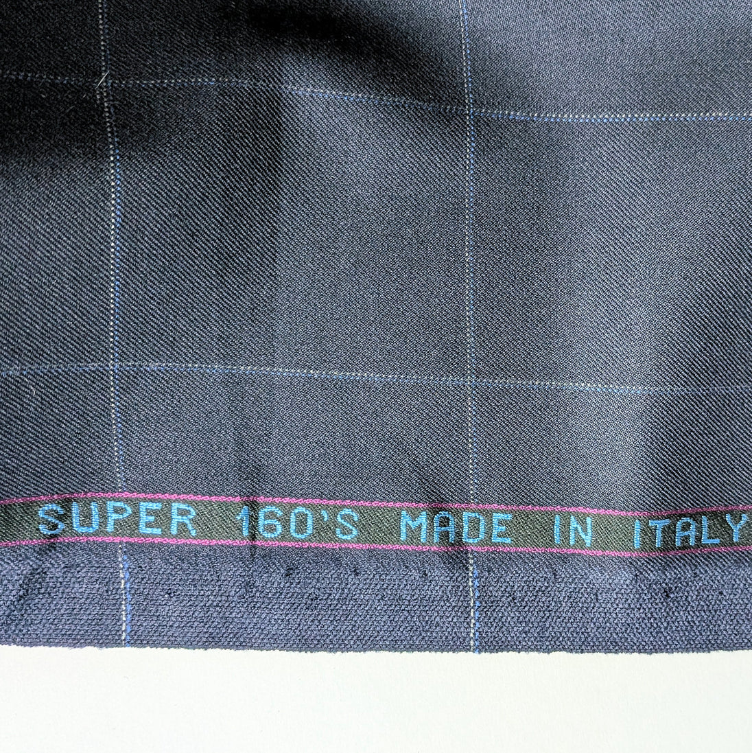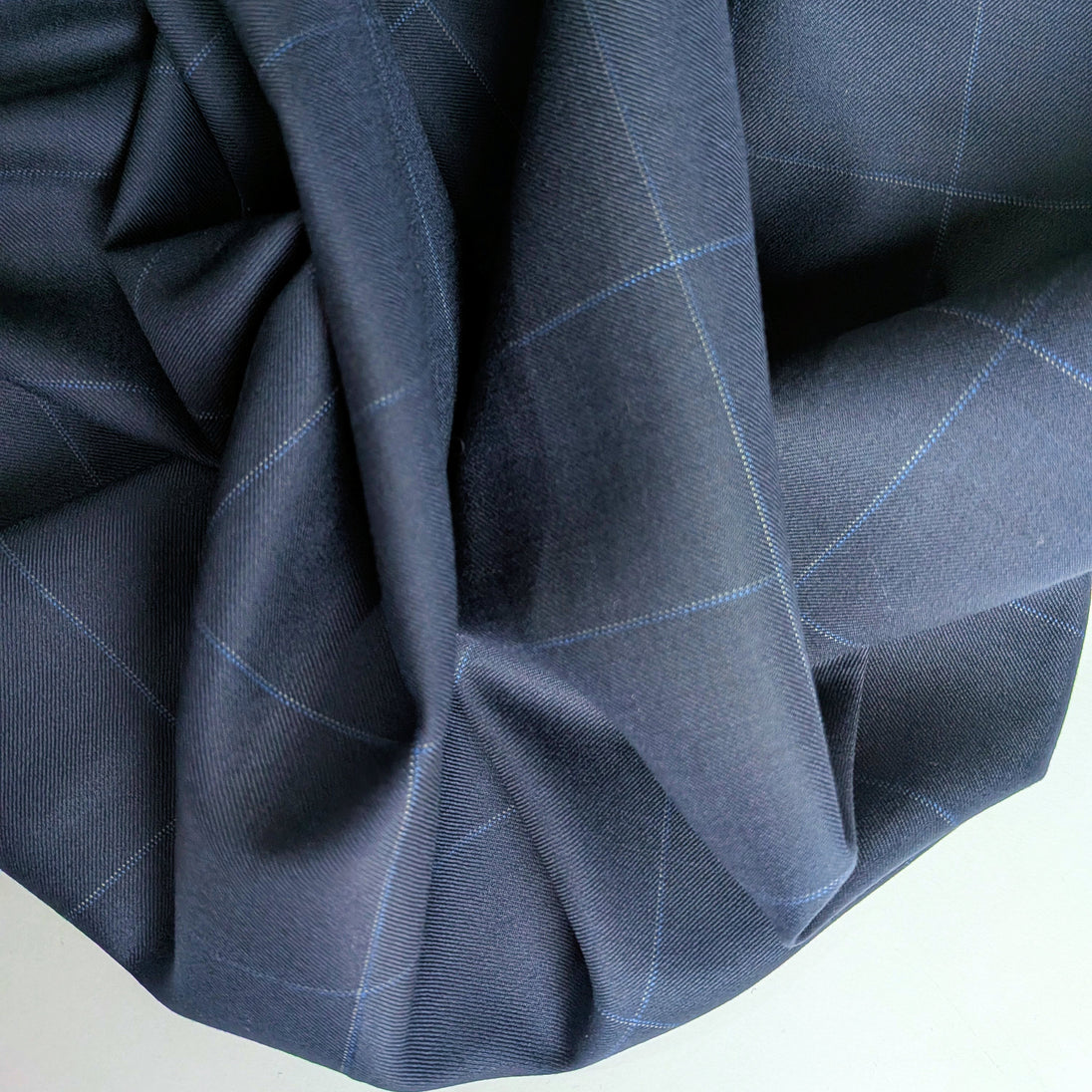 Shirt weight tightly woven fabric in a blue color with a hint of gray. The fabric is made of Superfine 160 wool in Italy. The material is 58 inches wide. The windowpane plaid is 1 3/4 X 2".