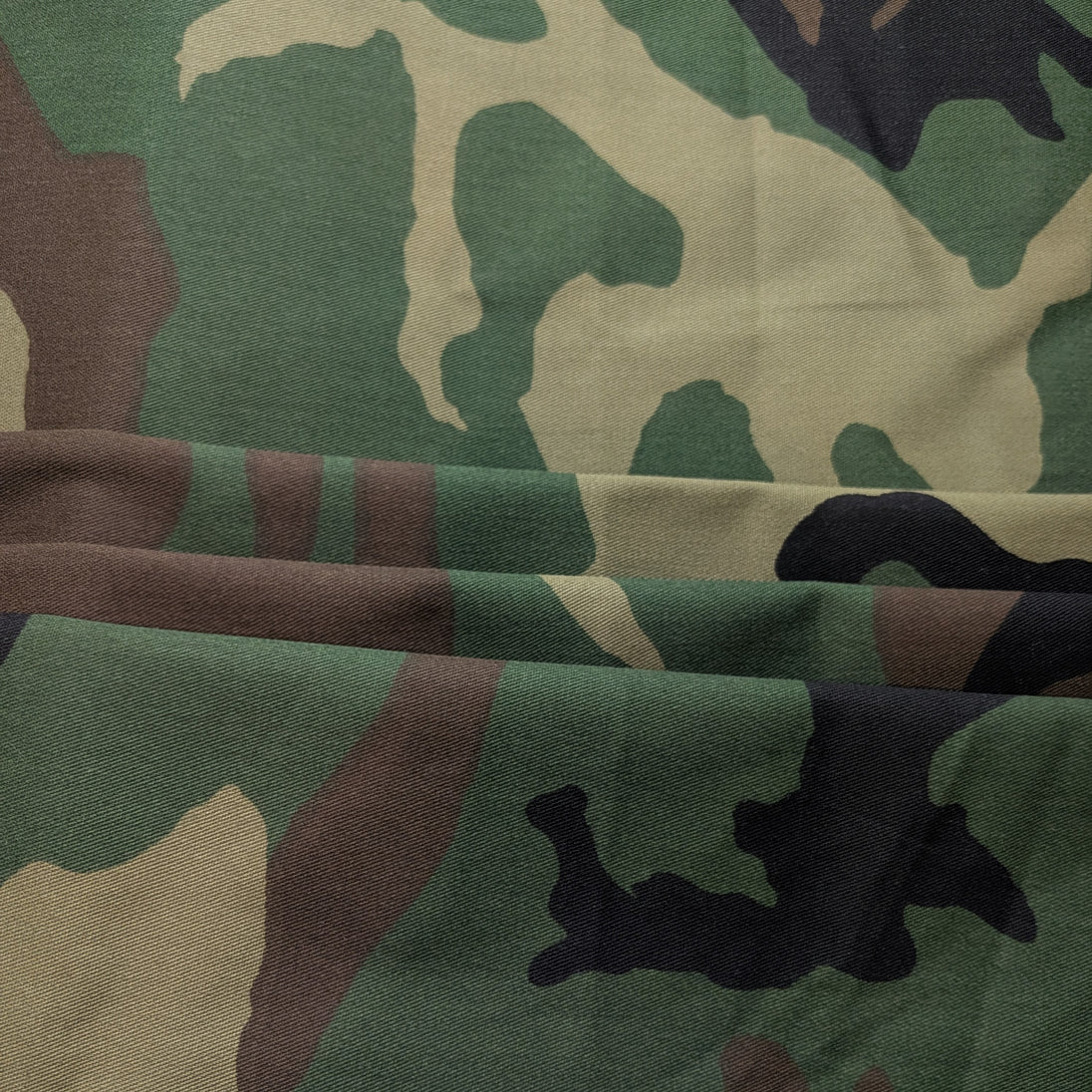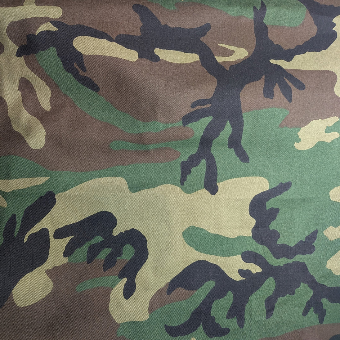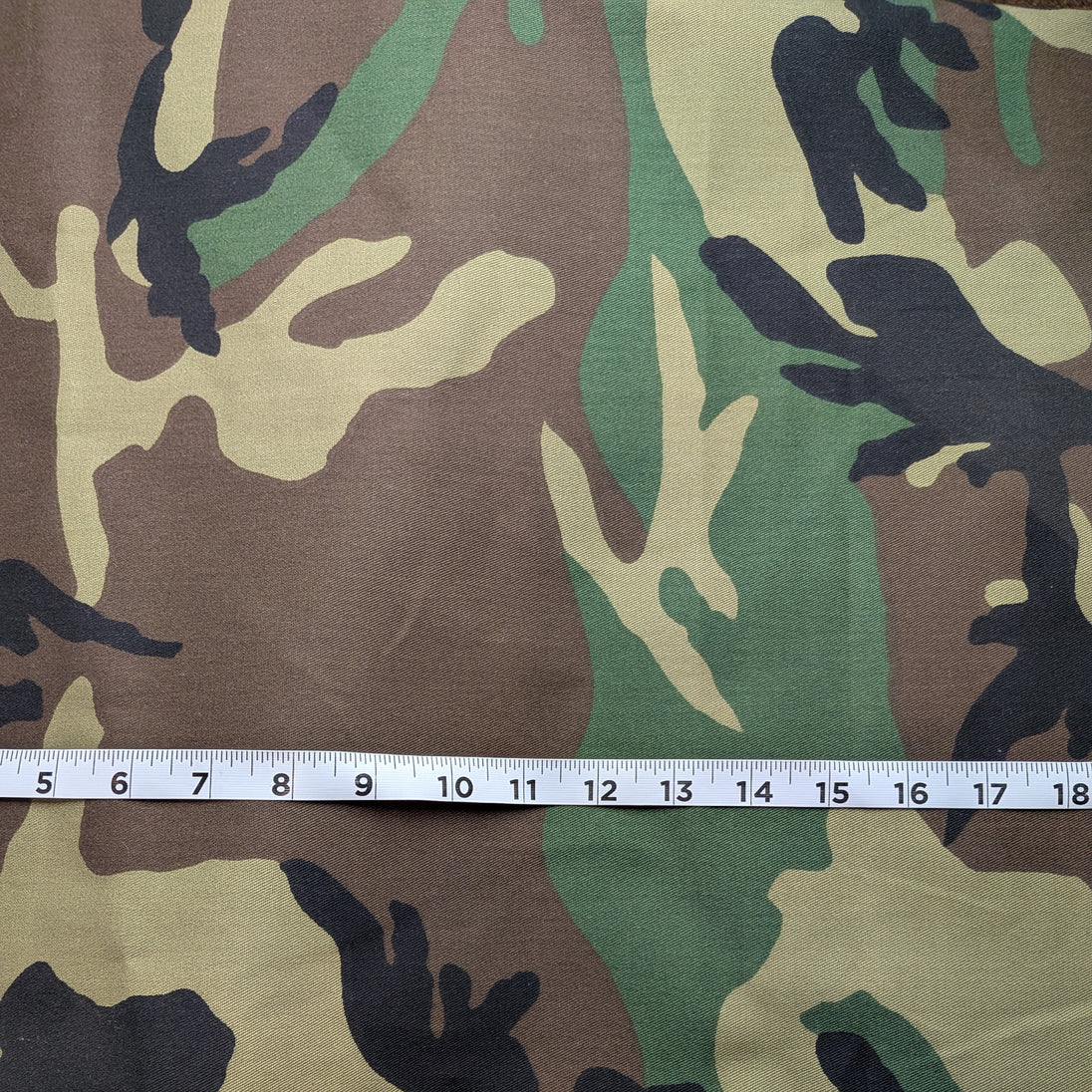 The large camo design is made of cotton and polyester, tightly woven with high thread count. This fabric has a large pattern and repeat in a random pattern of black, green, brown, and tan. The fabric is a heavier twill at 12 oz/yard and is designed to sew easily and wear like iron. Perfect for hunting, bags, and other uses.