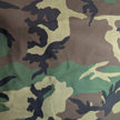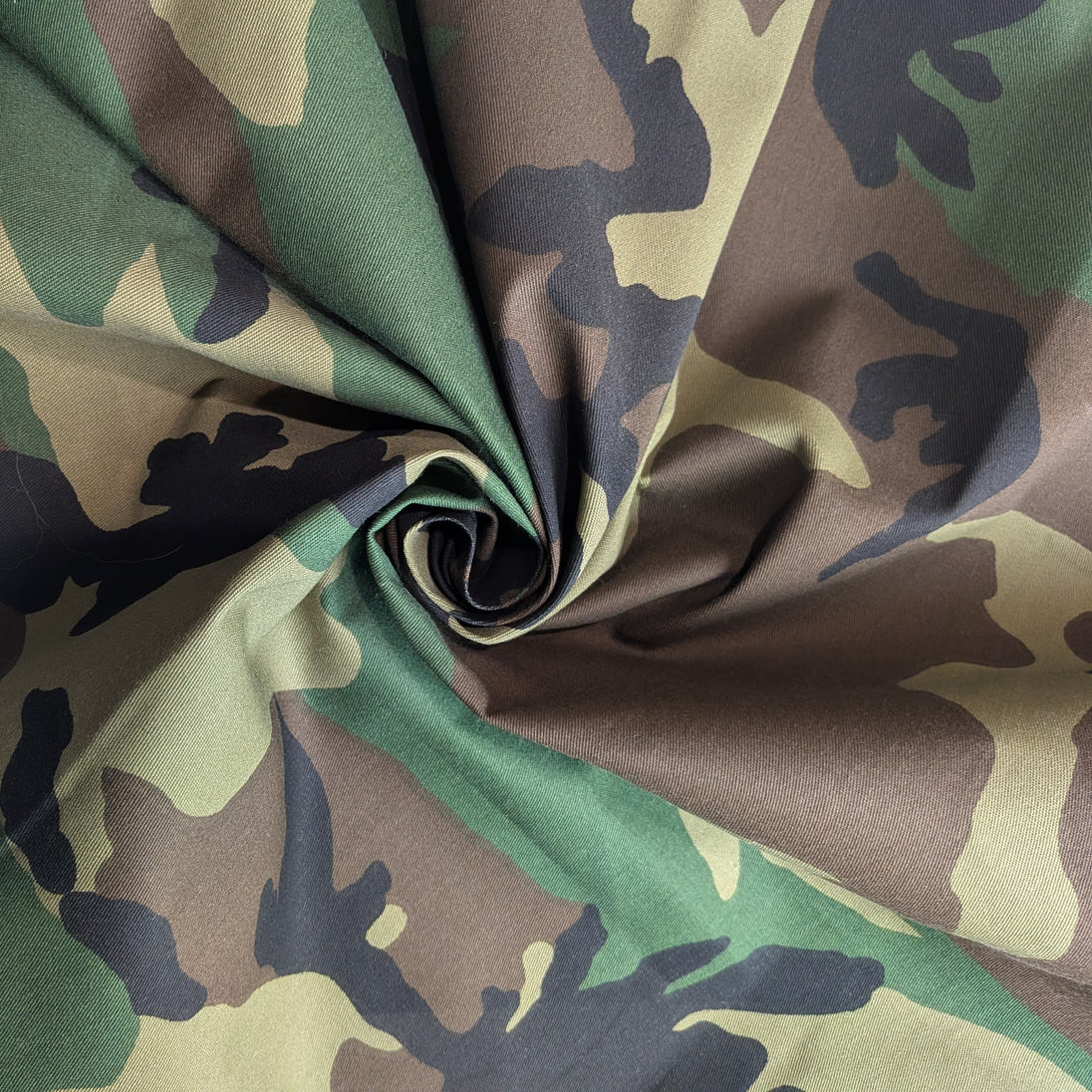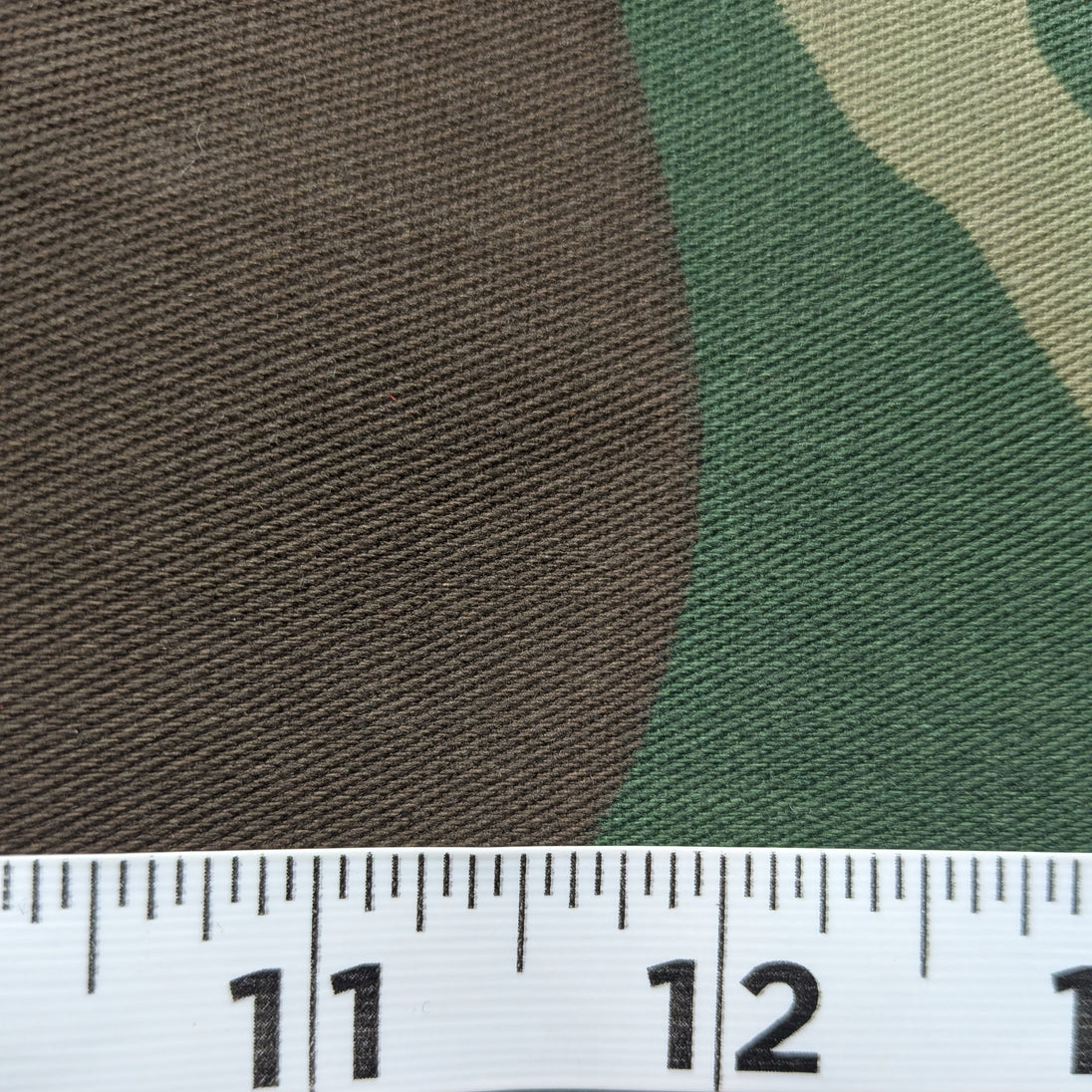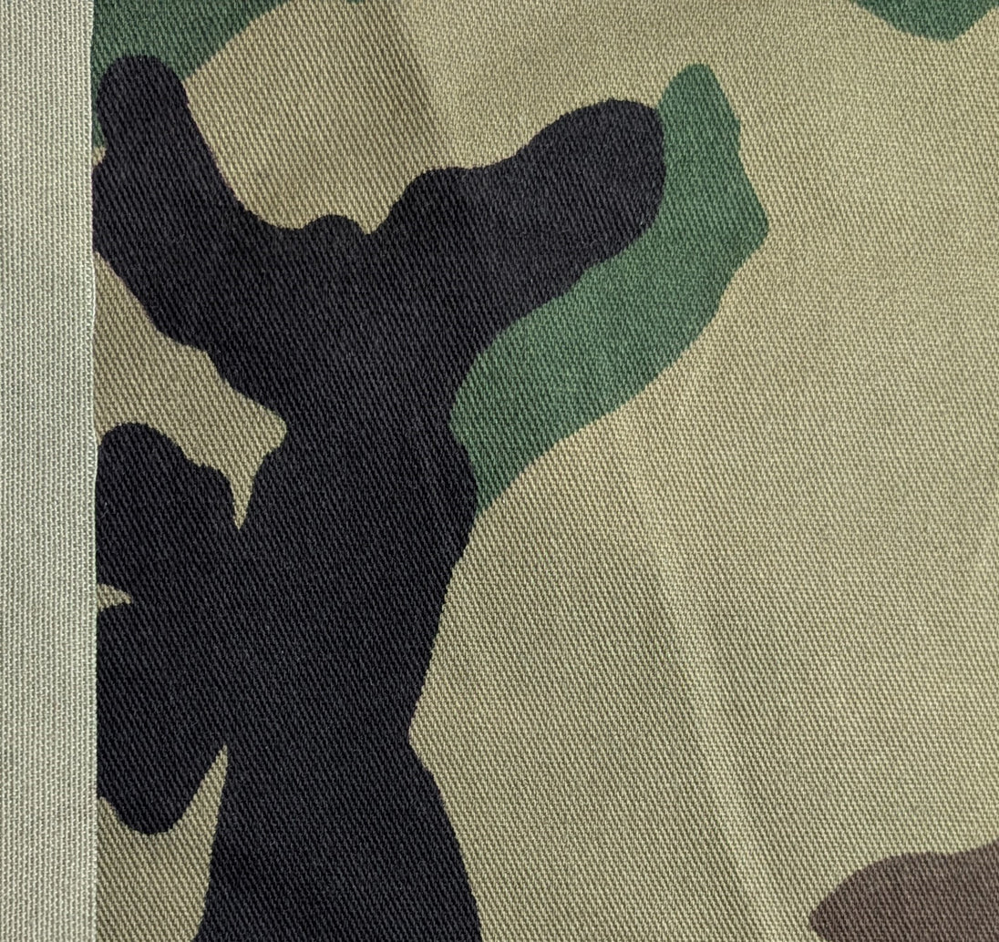The large camo design is made of cotton and polyester, tightly woven with high thread count. This fabric has a large pattern and repeat in a random pattern of black, green, brown, and tan. The fabric is a heavier twill at 12 oz/yard and is designed to sew easily and wear like iron. Perfect for hunting, bags, and other uses.