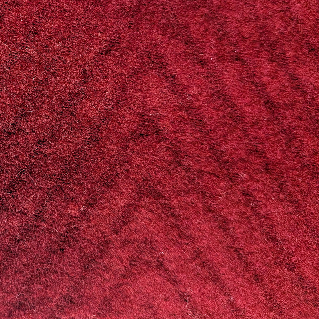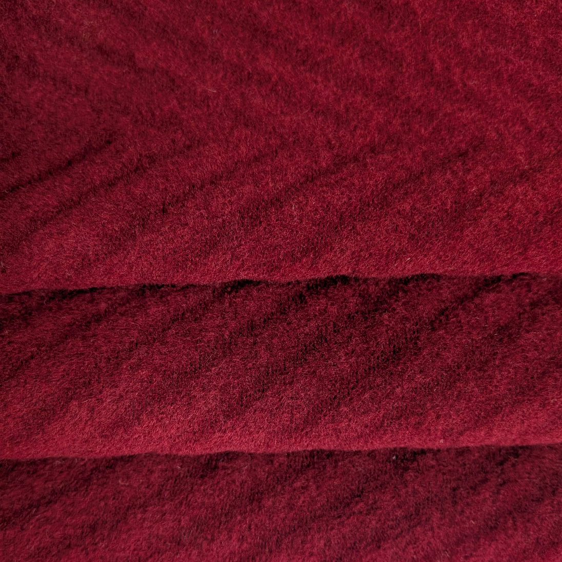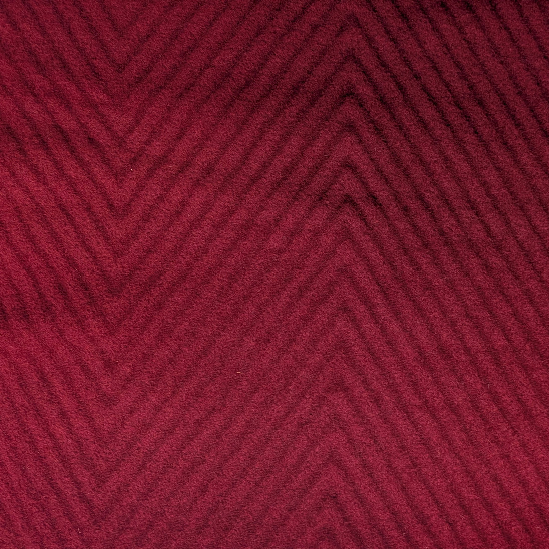 Double-sided wool in a cardinal red with a blue undertone color. Brand new fabric is tightly woven, and weighing in at 14 oz/yard. Brushed texture on both sides which feels lovely on the skin. It is thicker than a flannel but light enough to make a shirt. It does have about 50% stretch between the selvages. The lare herringbone pattern is a 9 inch repeat.