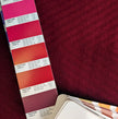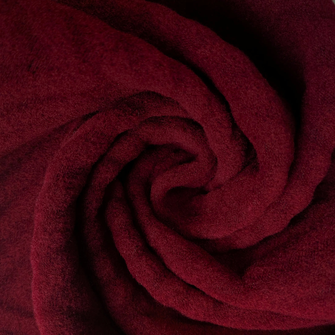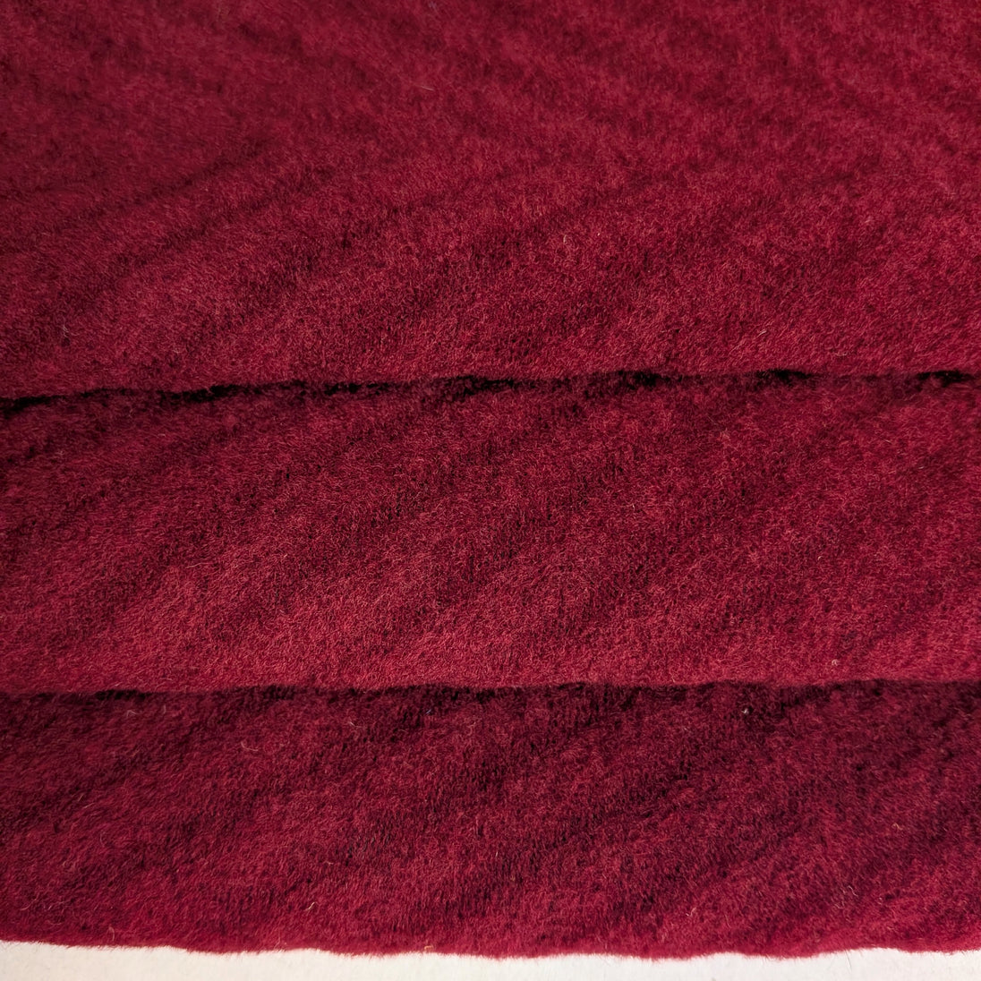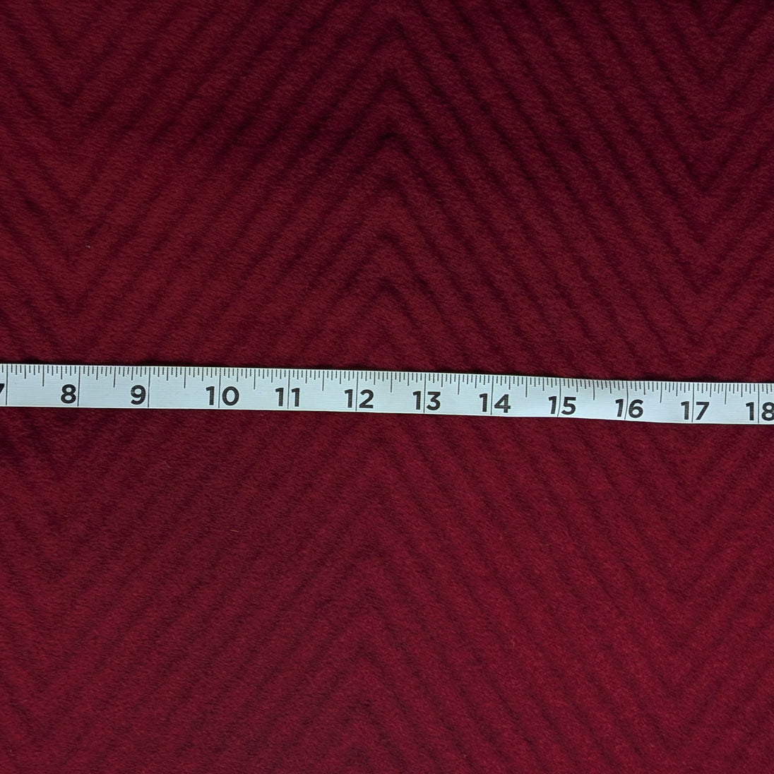 Double-sided wool in a cardinal red with a blue undertone color. Brand new fabric is tightly woven, and weighing in at 14 oz/yard. Brushed texture on both sides which feels lovely on the skin. It is thicker than a flannel but light enough to make a shirt. It does have about 50% stretch between the selvages. The lare herringbone pattern is a 9 inch repeat.