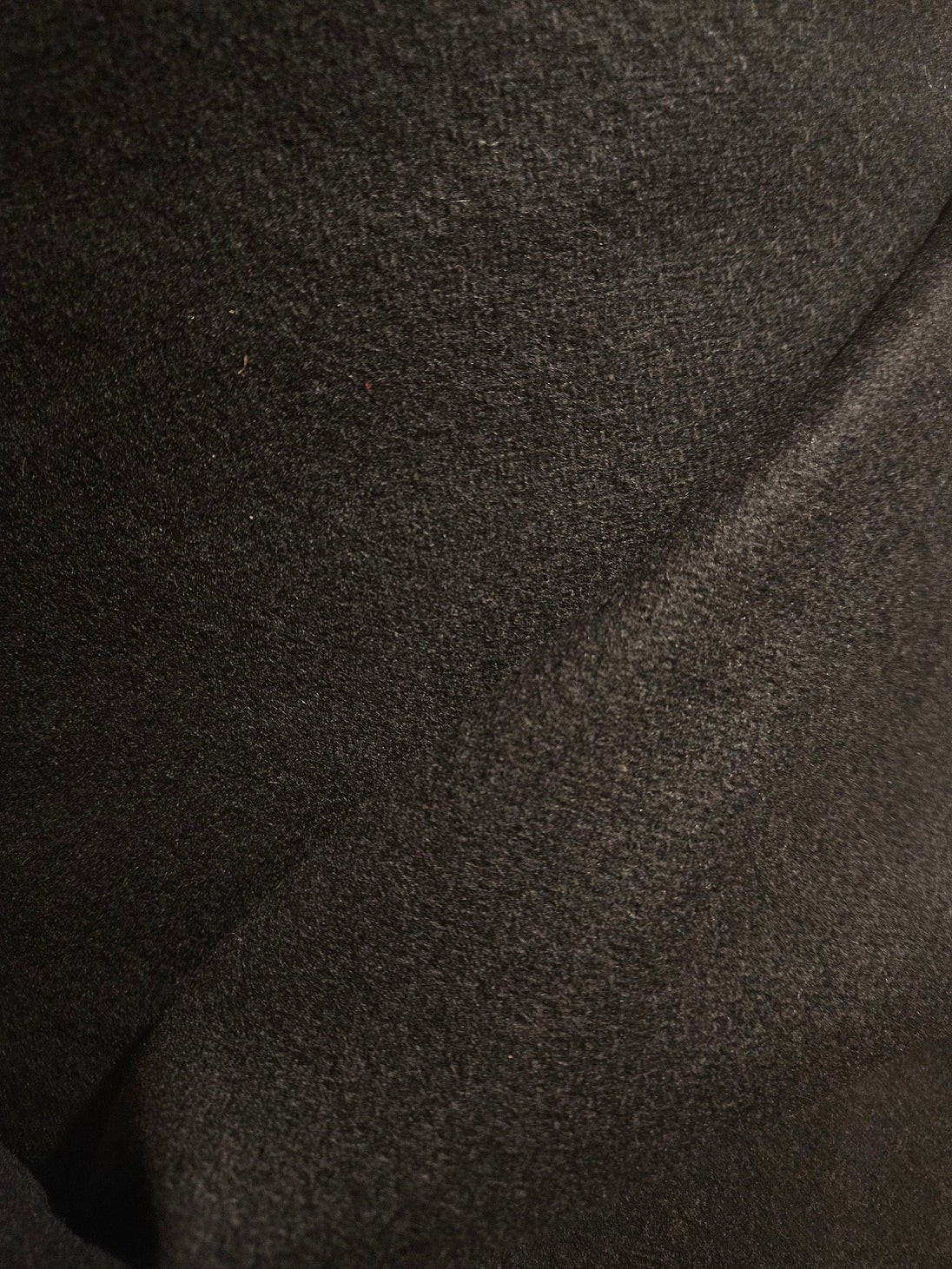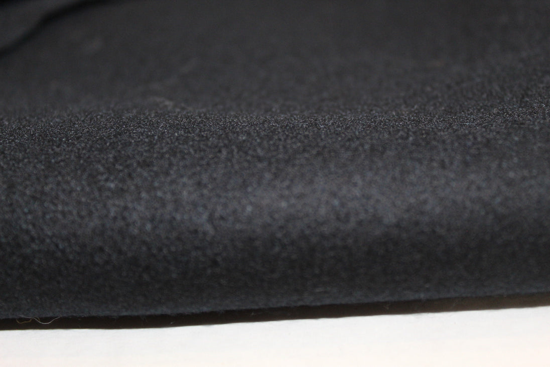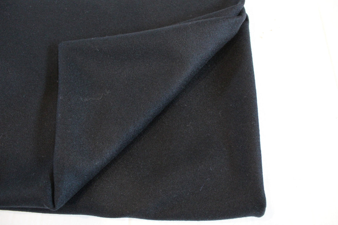 Coat-weight melton wool. Brand new fabric in a solid black, tightly woven and heavier weight at over a pound per yard, almost looks felted. This material is stiffer and denser than other fabrics and would work well if sewing with thinner seams or clipping inner seams.