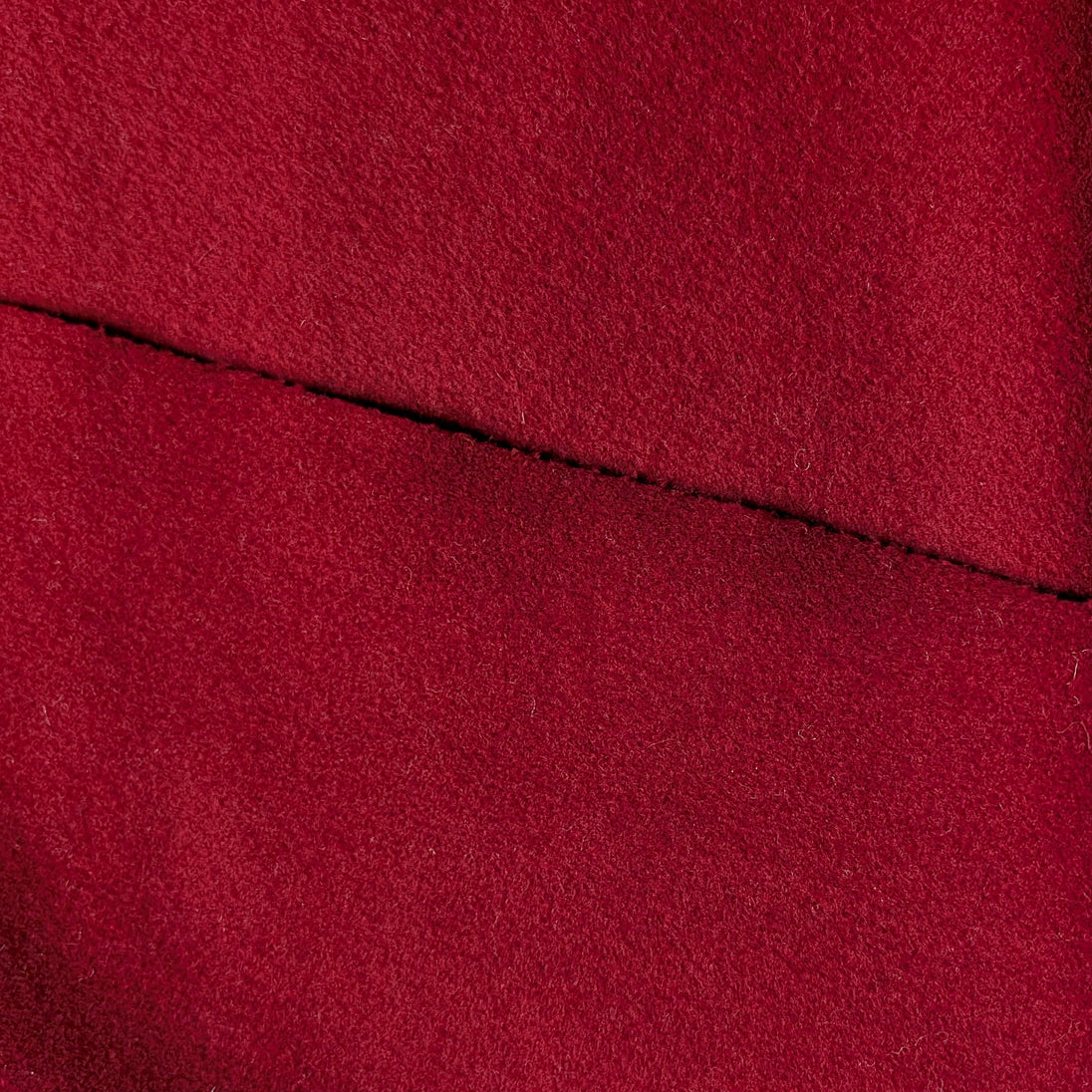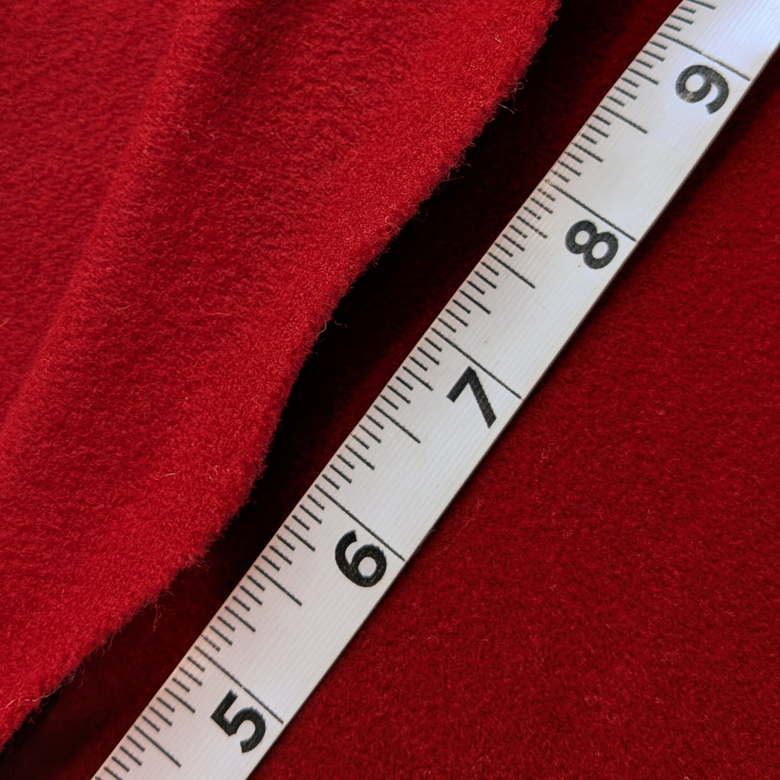 Double-sided wool in a true red color. Brand new fabric is tightly woven, and weighing in at 13 oz/yard, looking felted. Brushed texture on both sides which feels lovely on the skin. It is thicker than a flannel but light enough to make a shirt.