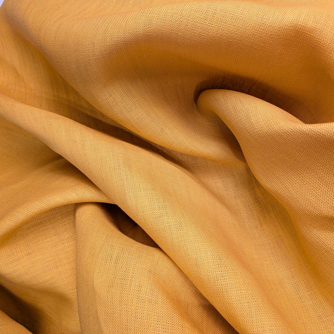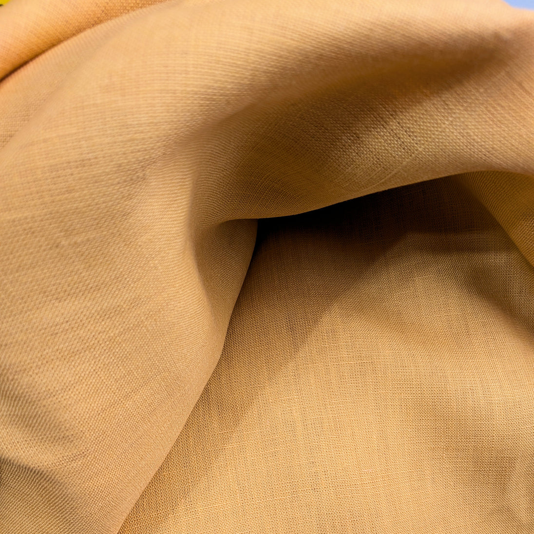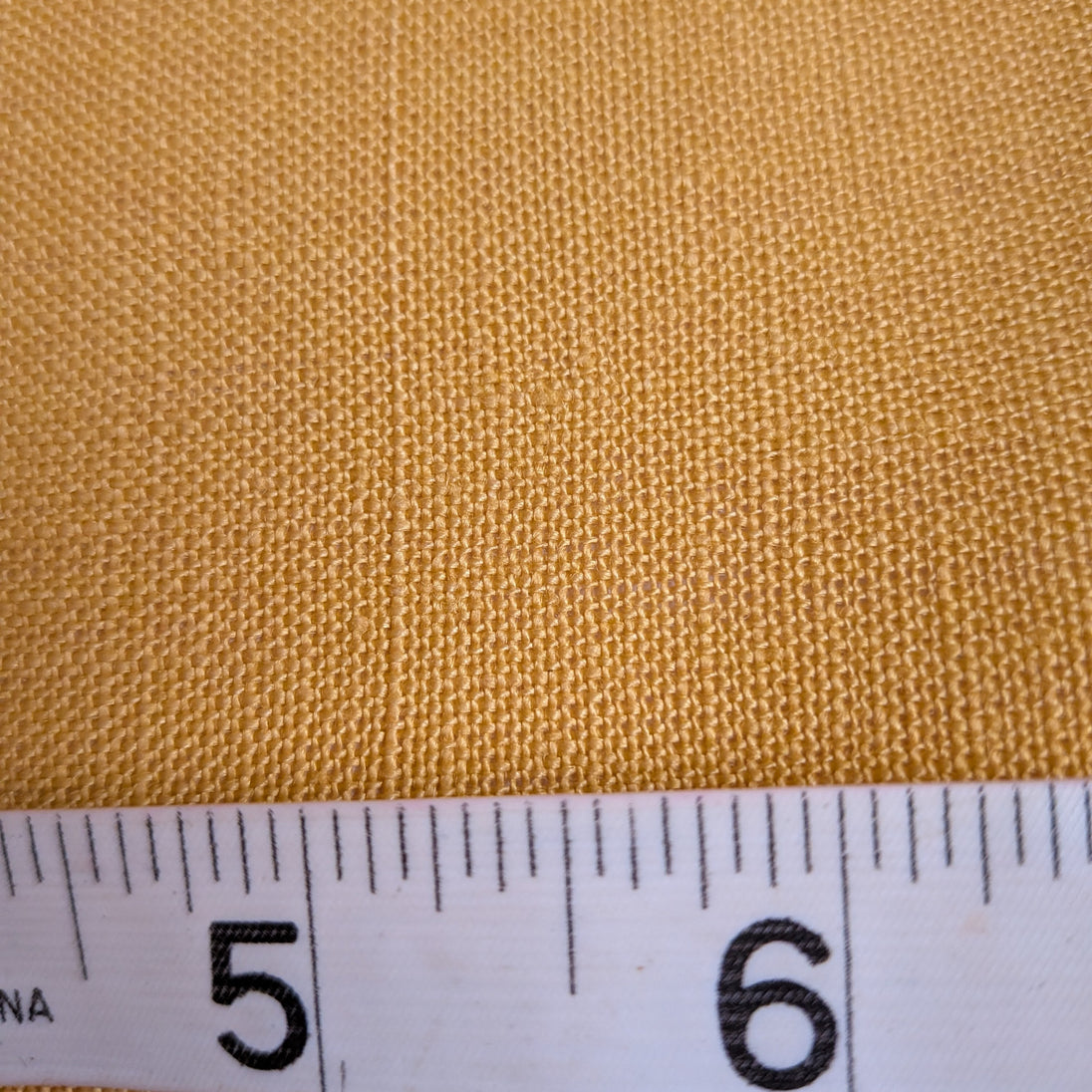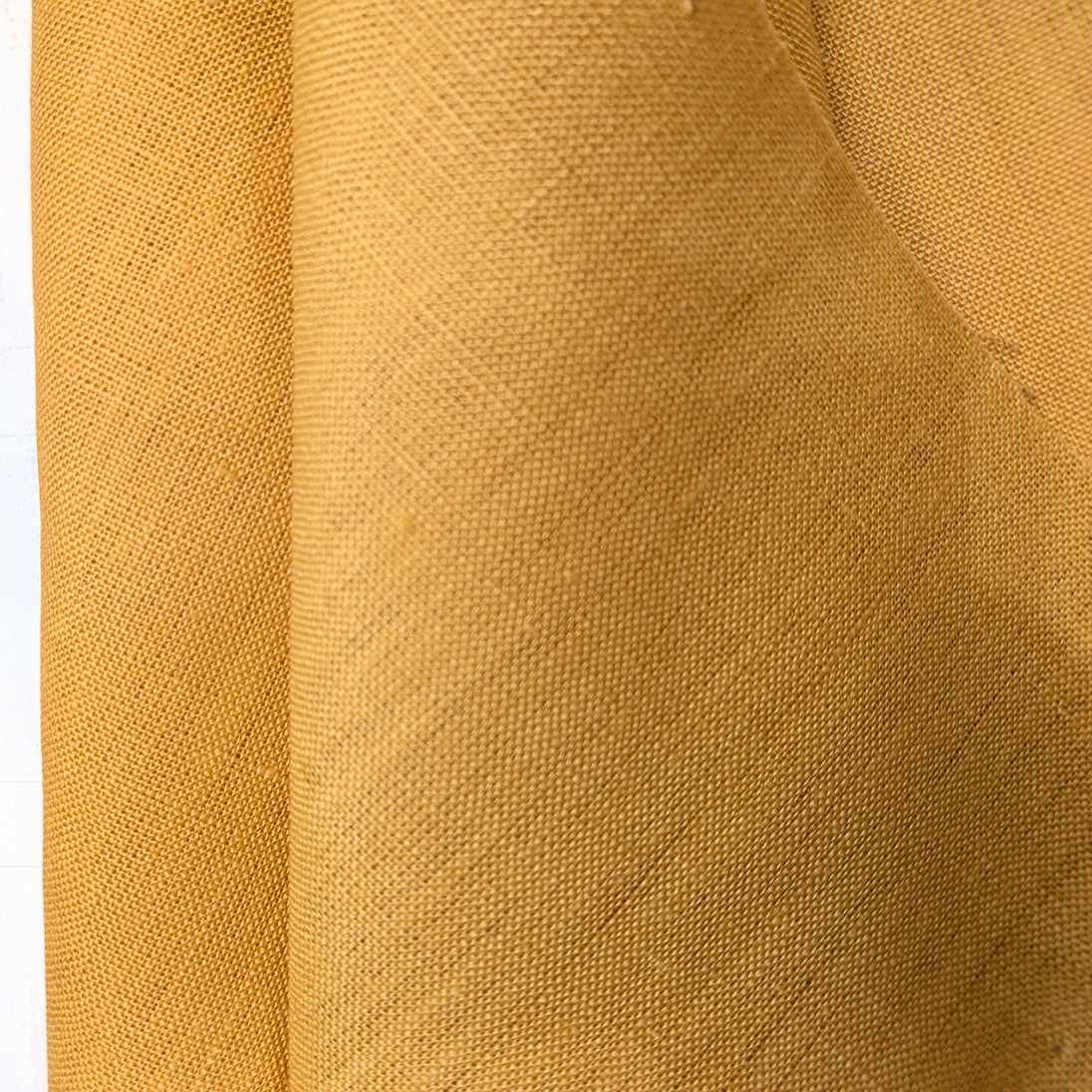 All natural 100% linen, tightly woven with high thread count. It is a deep rich yellow color. This is a thicker material softening after each wash.