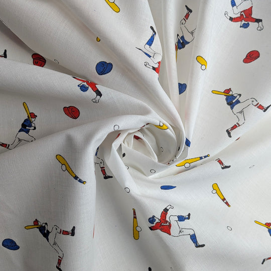 Yarn dyed linen blend is a high quality, breathable fabric. Perfect fabric for summer apparel. Great for quilting, dresses and pants and more! 90% opaque with a soft hand. Baseball players, bats and hats in primary...Regular price $7.97 -