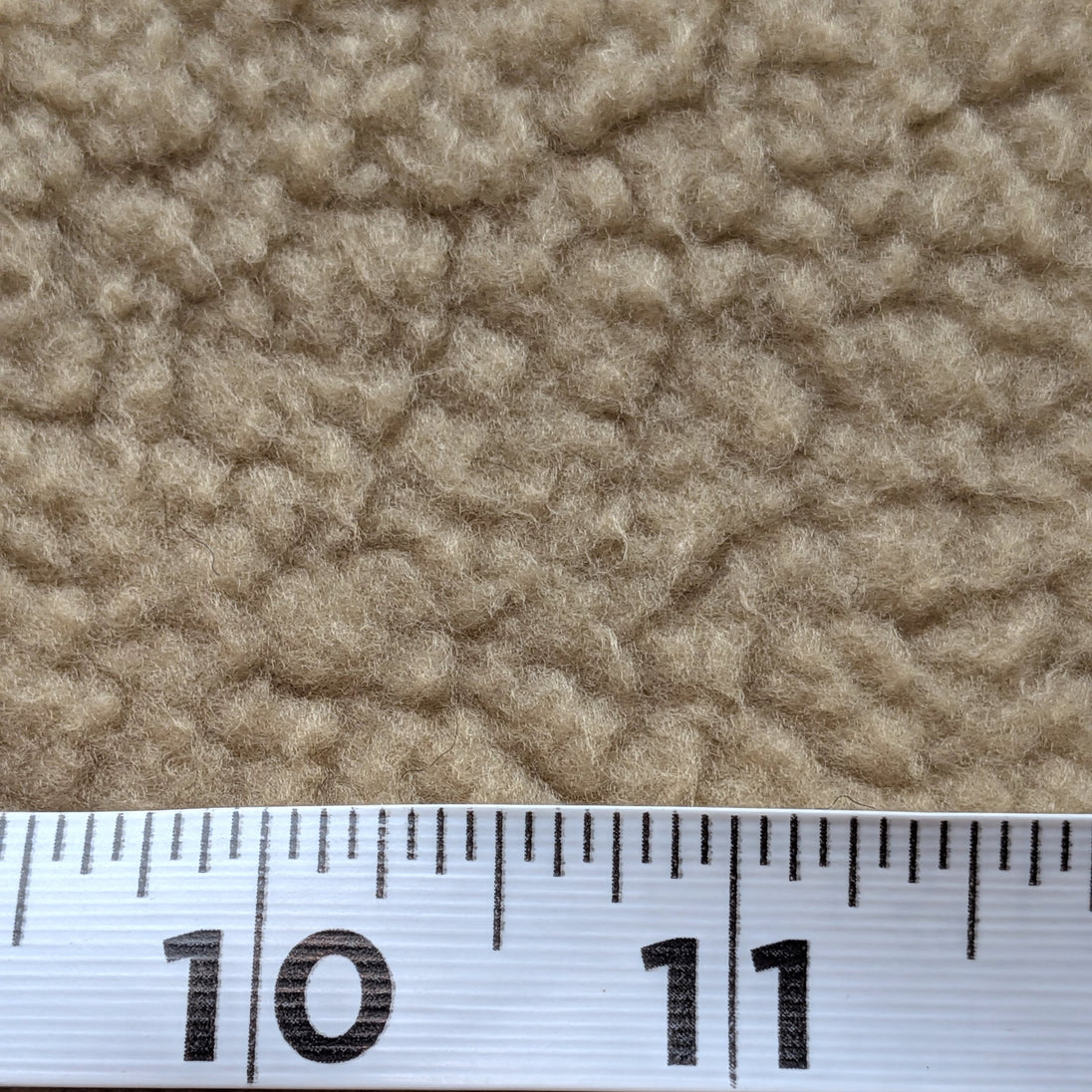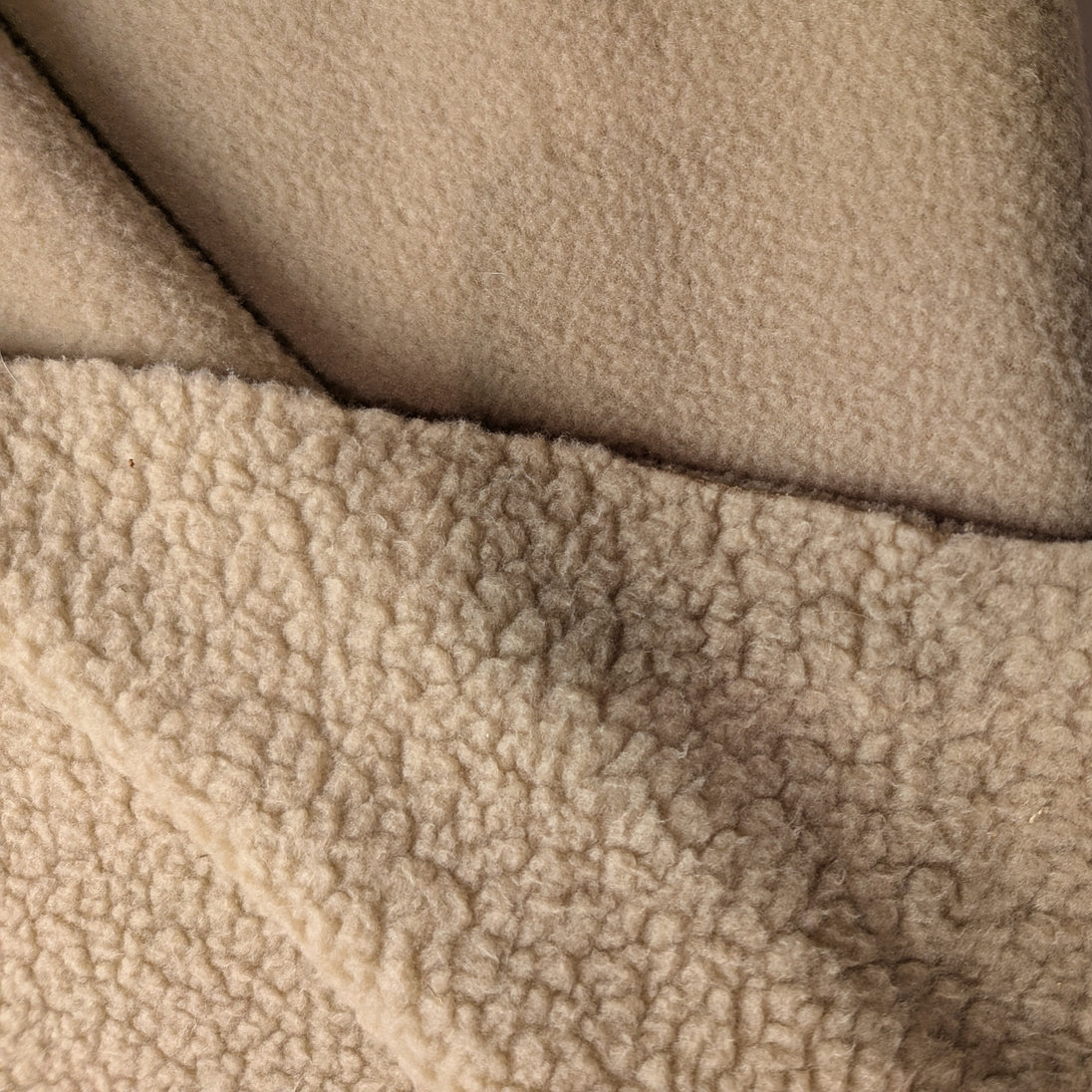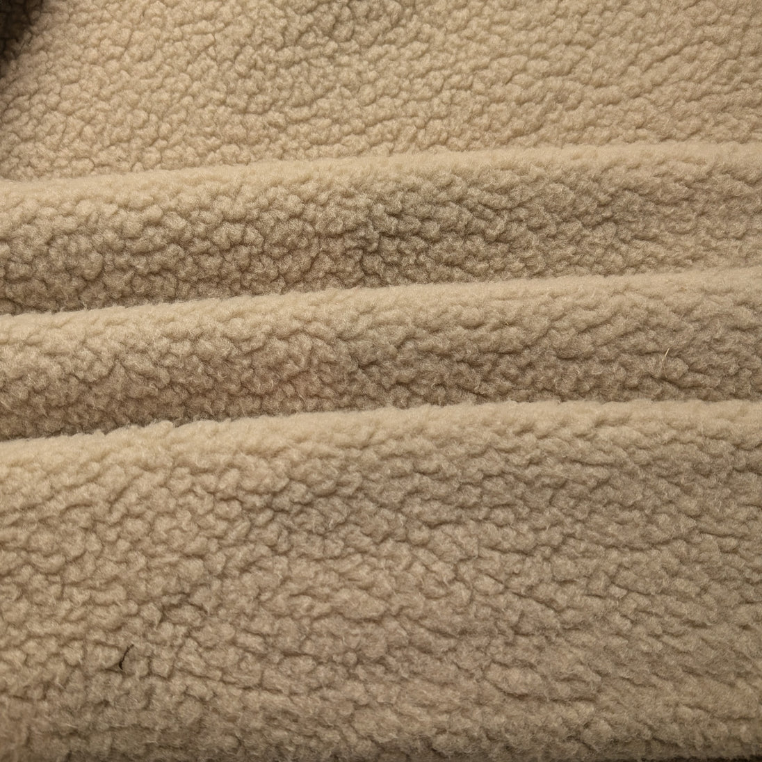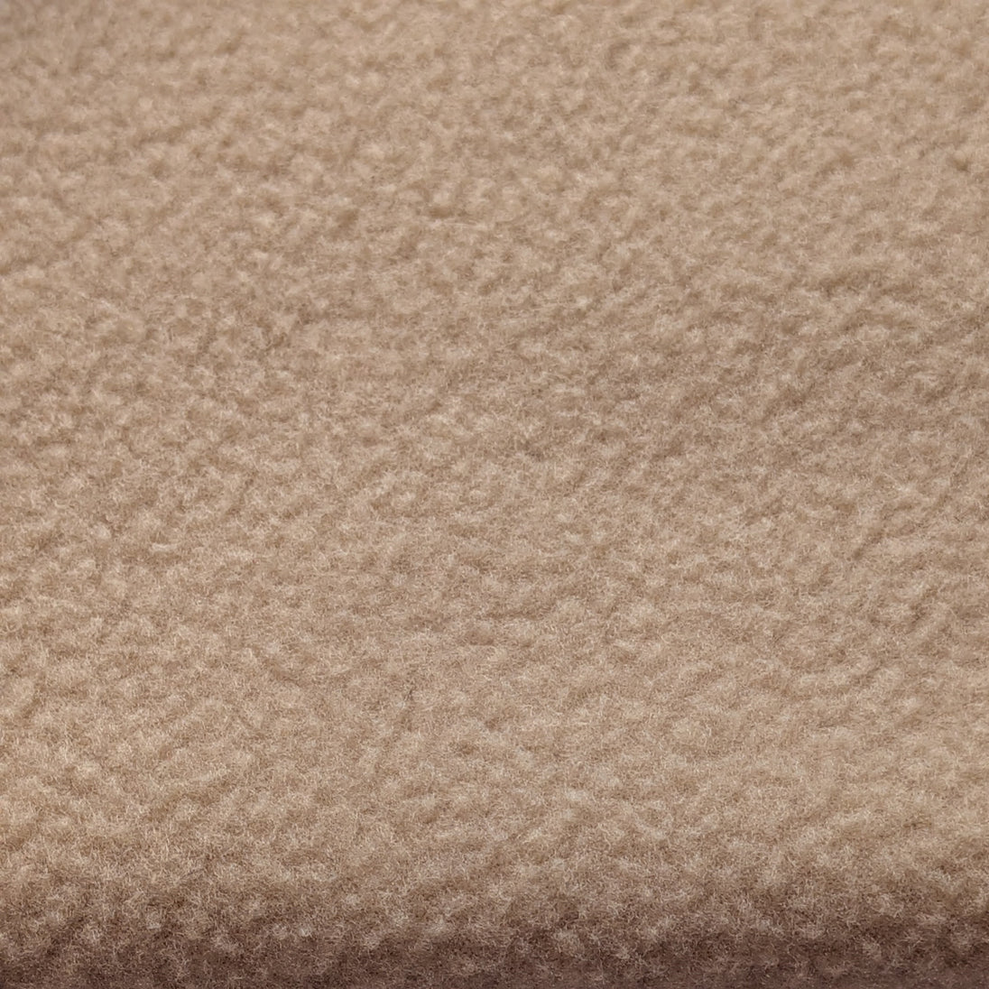 Pale tan polar fleece fabric is a double-sided, knit fabric that is very comfortable and insulating. Tightly woven from 100% polyester fibers, polar fleece is brushed, then trimmed to create a soft, raised texture. Using innovative anti-pill techniques, polar fleece is manufactured to withstand everyday wear without forming any surface defects. A light-weight alternative to wool, polar fleece weighs approximately 16oz per linear yard. Insulating and opaque, the loft hides stitches.