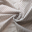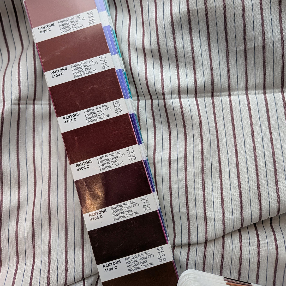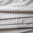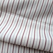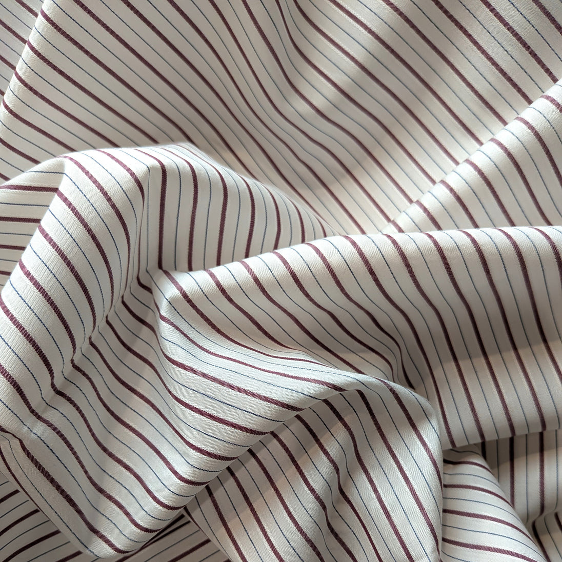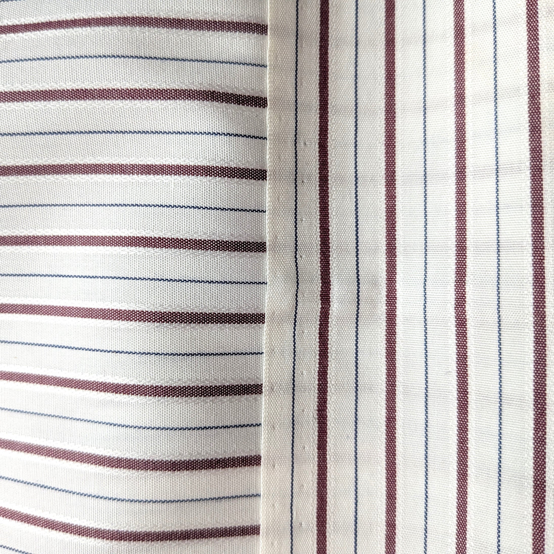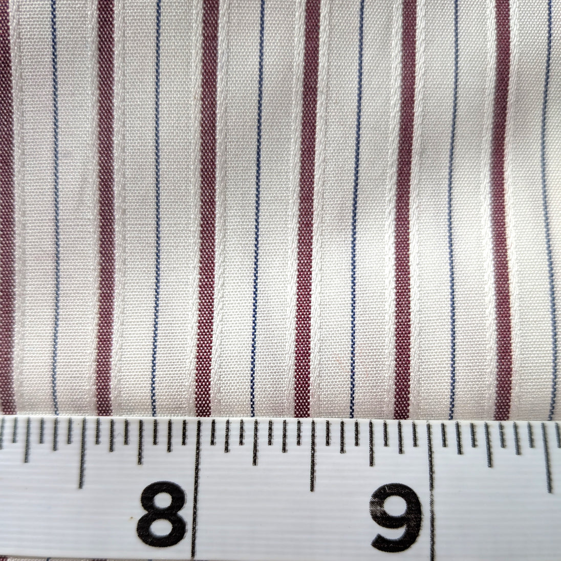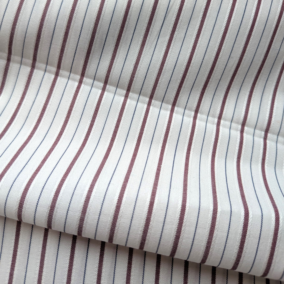 Lovely fine cotton fabric cotton, tightly woven with high thread count, creating a maroon stripe pattern on a 3/8 inch repeat. The stripe is bordered by raised white stitching with a thin blue line alternating with the other stripe. Soft hand with a little bit of body and is approx 80% opaque. It is 6 oz/yard.