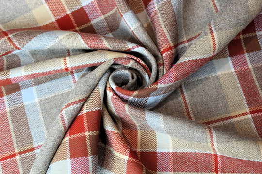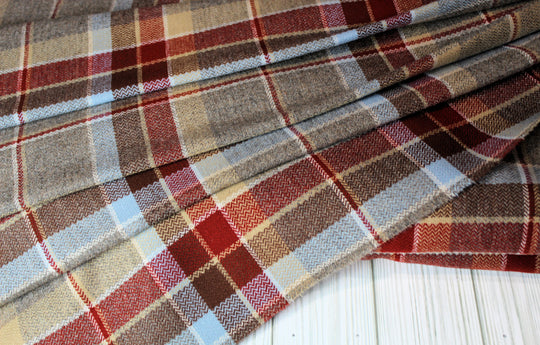 Flannel weight plaid of Pendelton wool. Brand new fabric, tightly woven material. The pattern provides a background of multi-colored red against soft brown and gray squares. The plaid has a counterpoint of red and pale blue...Regular price $18.97 -