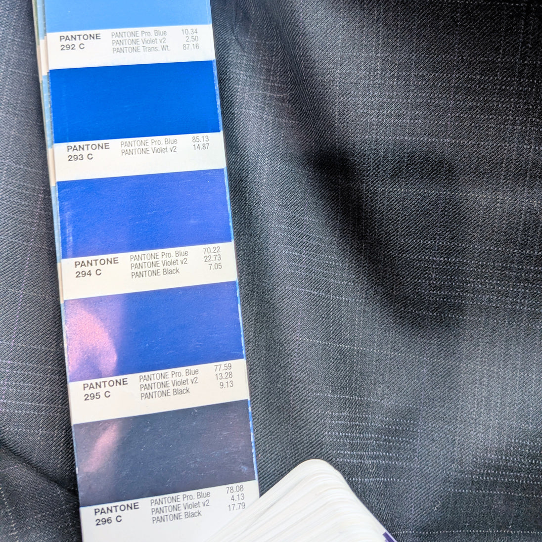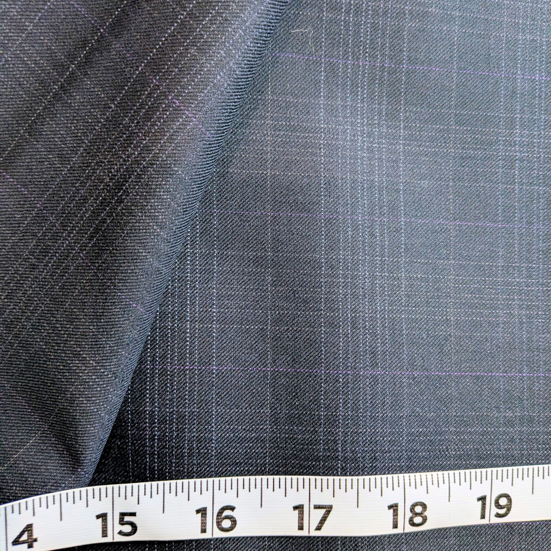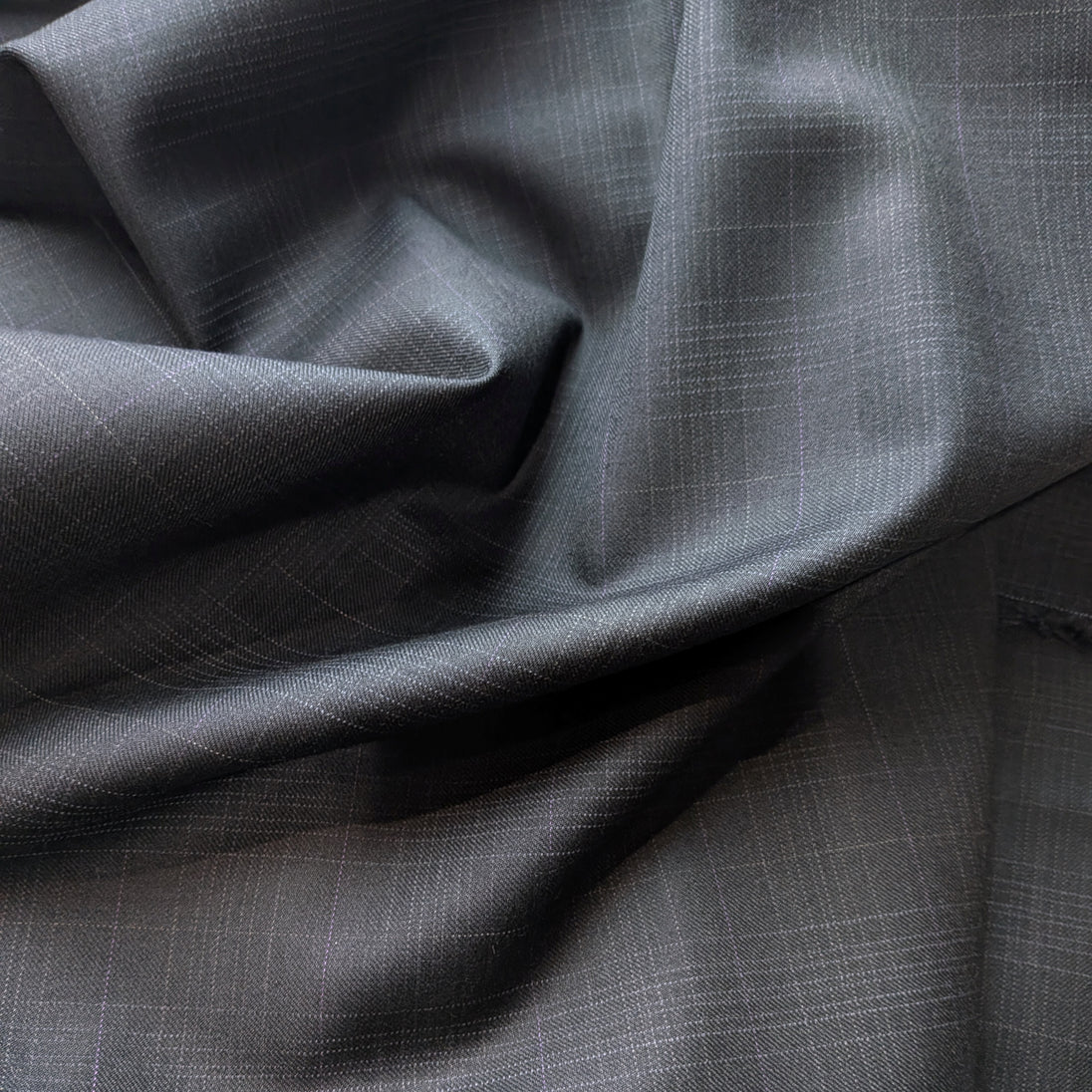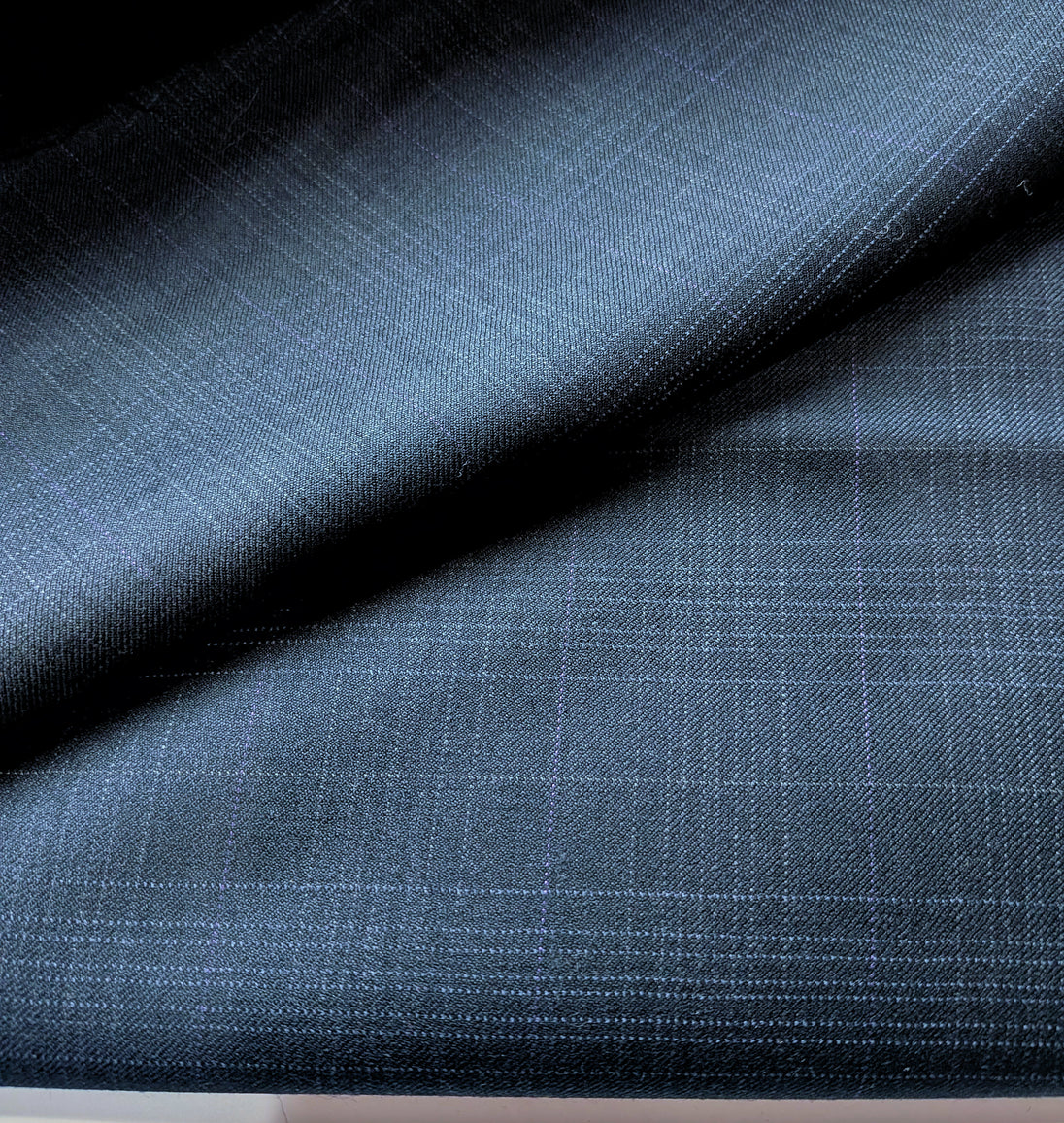 Shirt weight tightly woven fabric in a dark blue color in a plain weave. The fabric is made of worsted wool. The material is 58 inches wide and weighs in at 6 oz/yard.