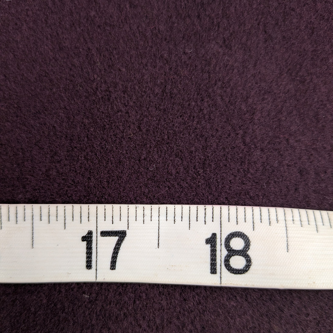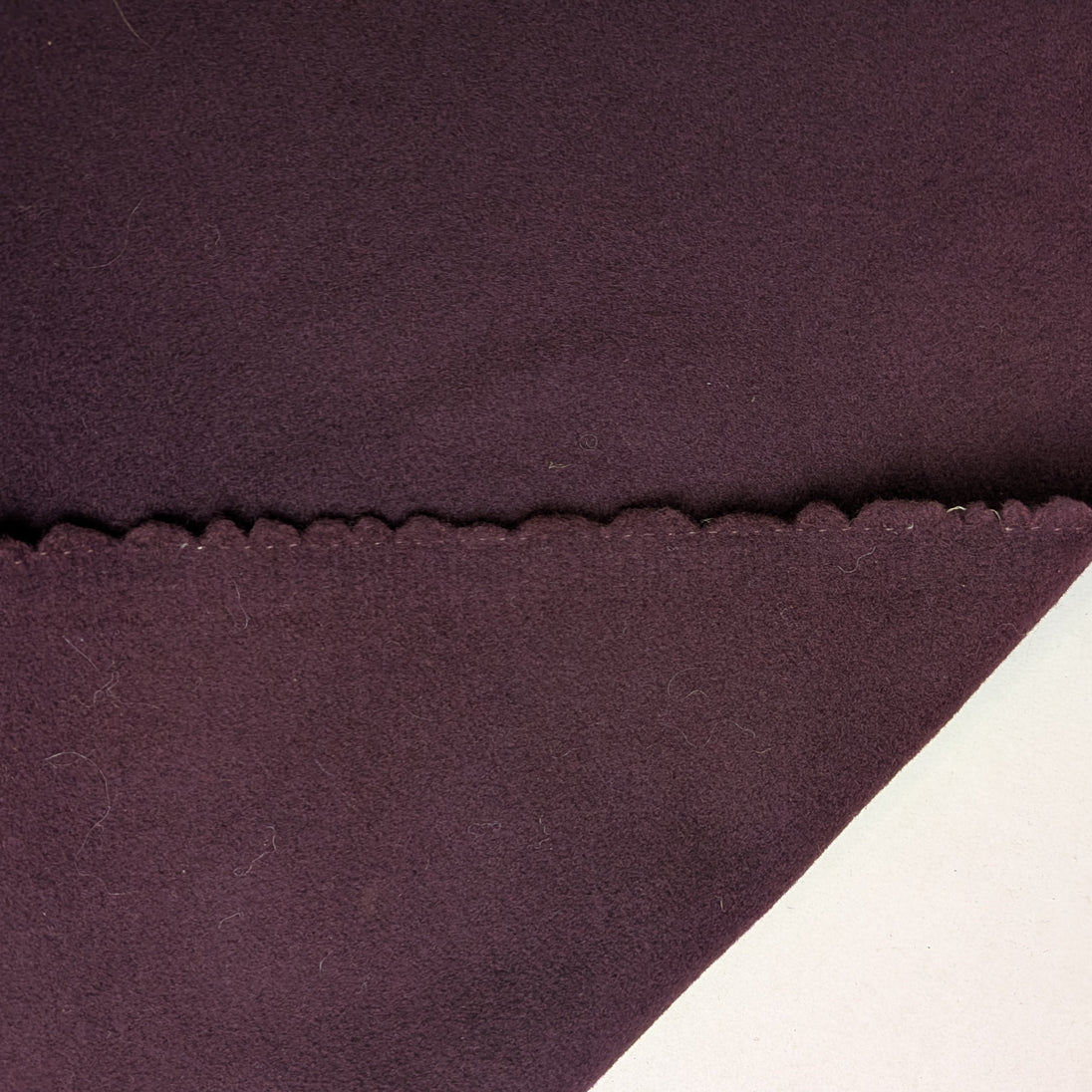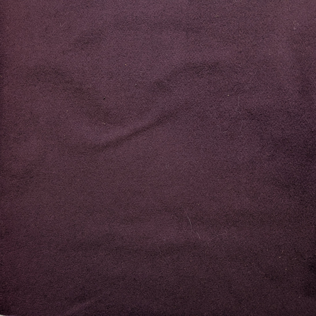 Coat-weight wool blend (70% wool and 30% nylon) in a deep purple color with a hint of underlying red. Brand new fabric is tightly woven, and heavier weight at 16 oz/yard, almost looks felted. Brushed texture on both sides which feels lovely on the skin.