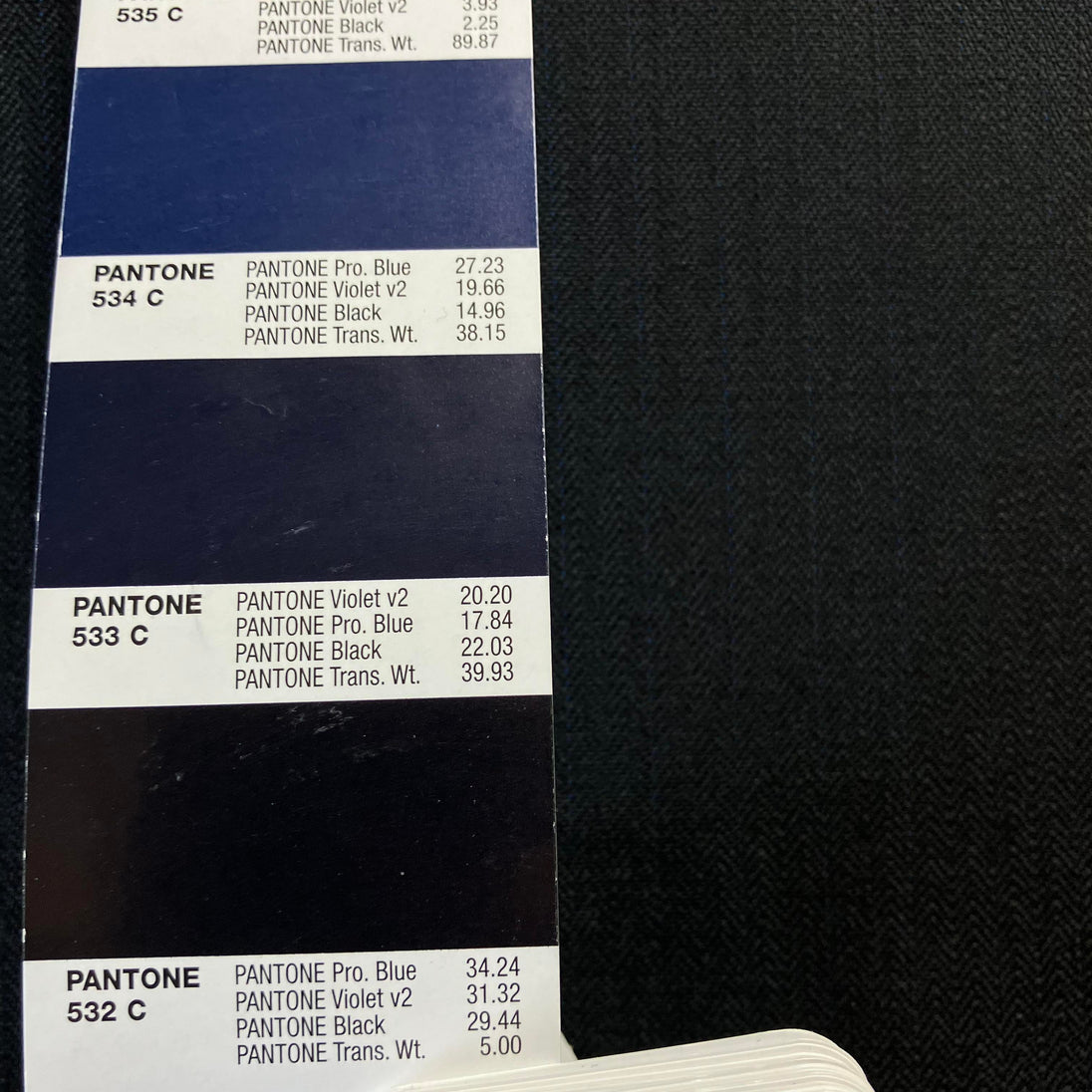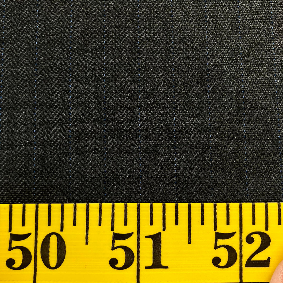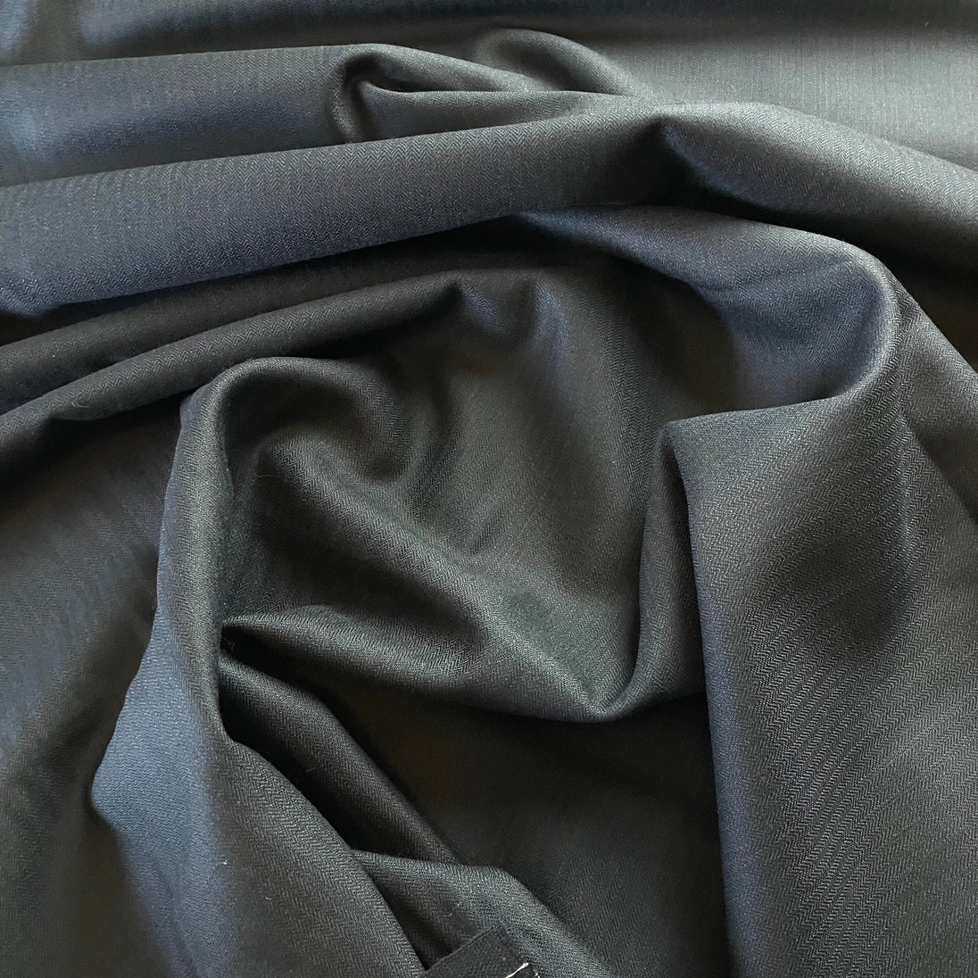 Shirt weight tightly woven fabric in deep black color woven into a fine herringbone pattern 1/8" apart. The material has a very subtle blue thread every 3/8 inch. The fabric is made of superfine wool woven in England.