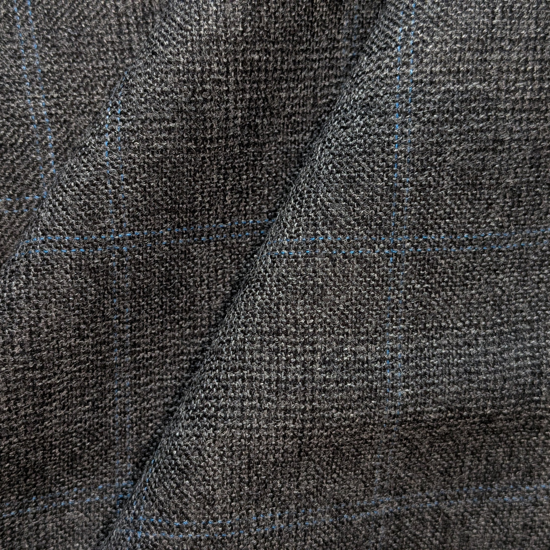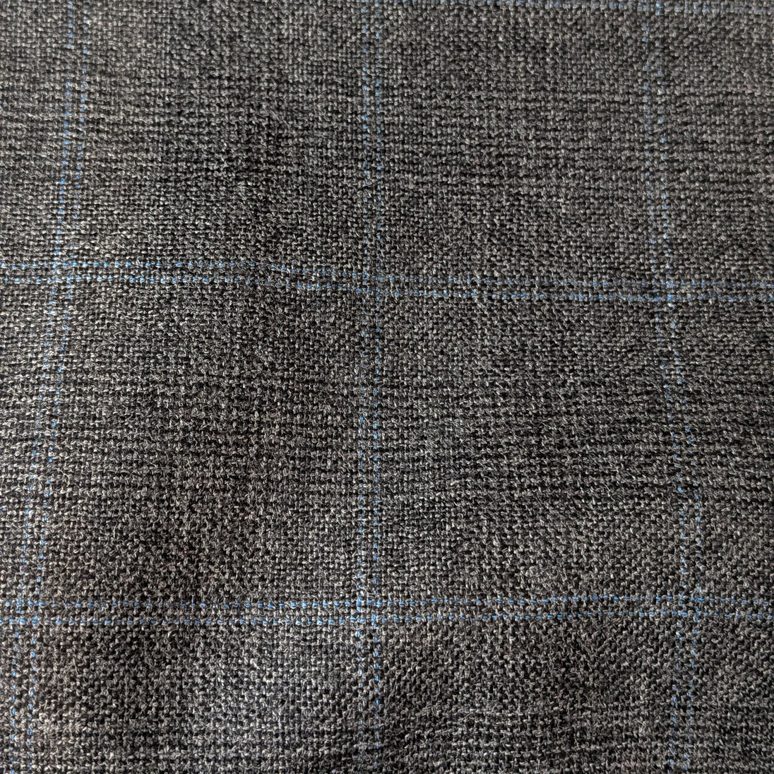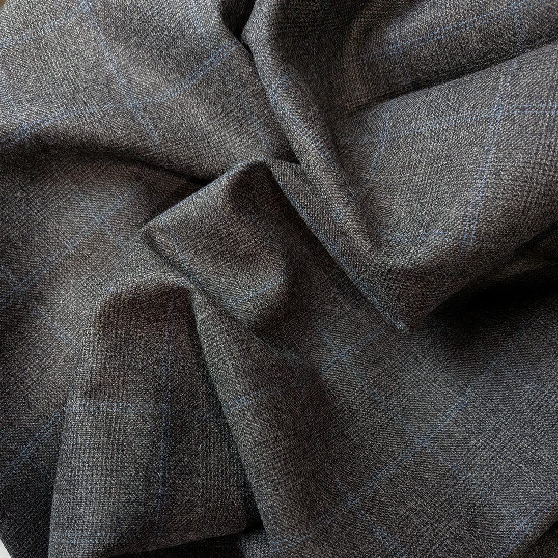 The plaid is composed of gray woven with lines of blue thread in an open windowpane plaid contrasting beautifully against the woven background, creating a subtle pattern. This distinct design complements any decor, adding a touch of elegance and warmth to your home or wardrobe.