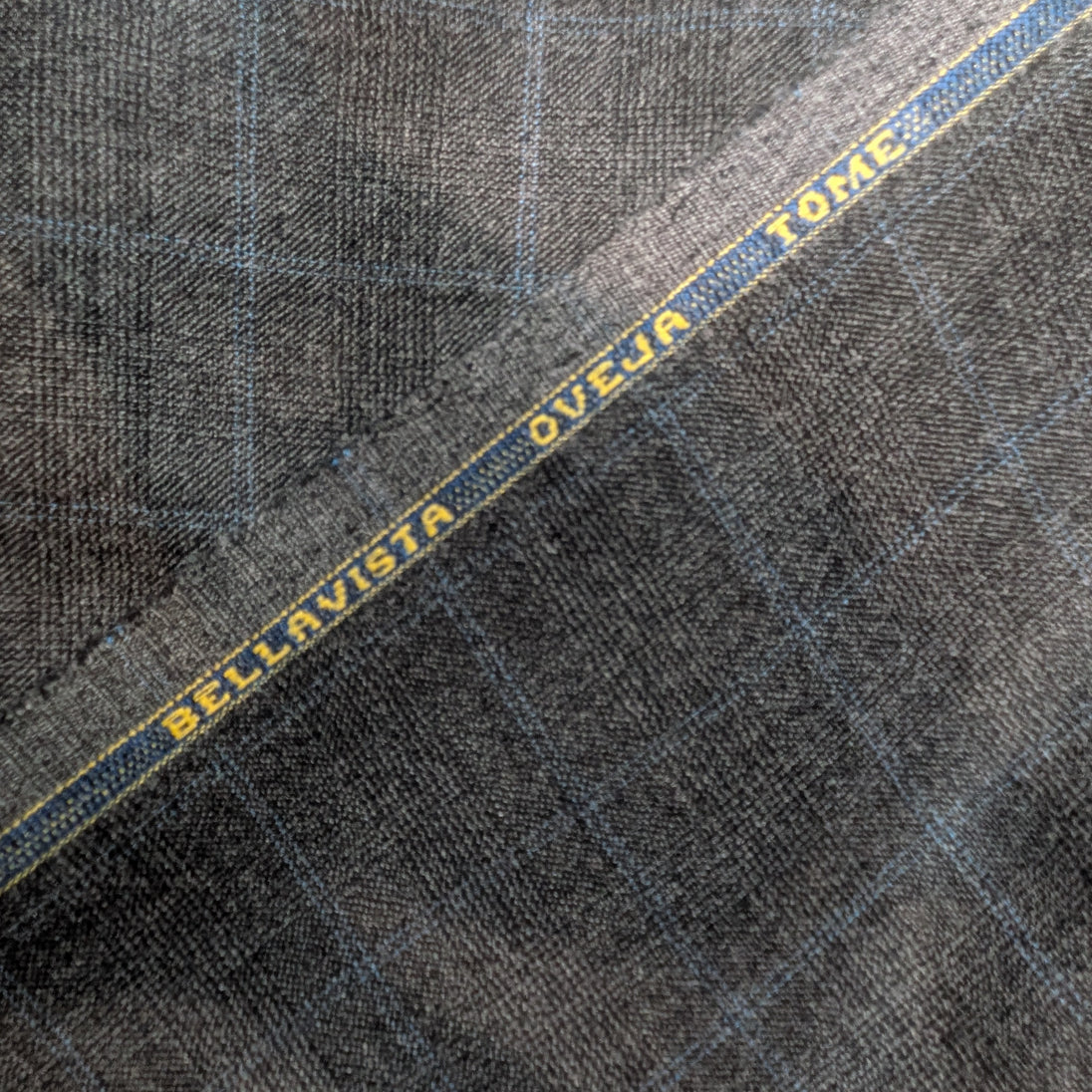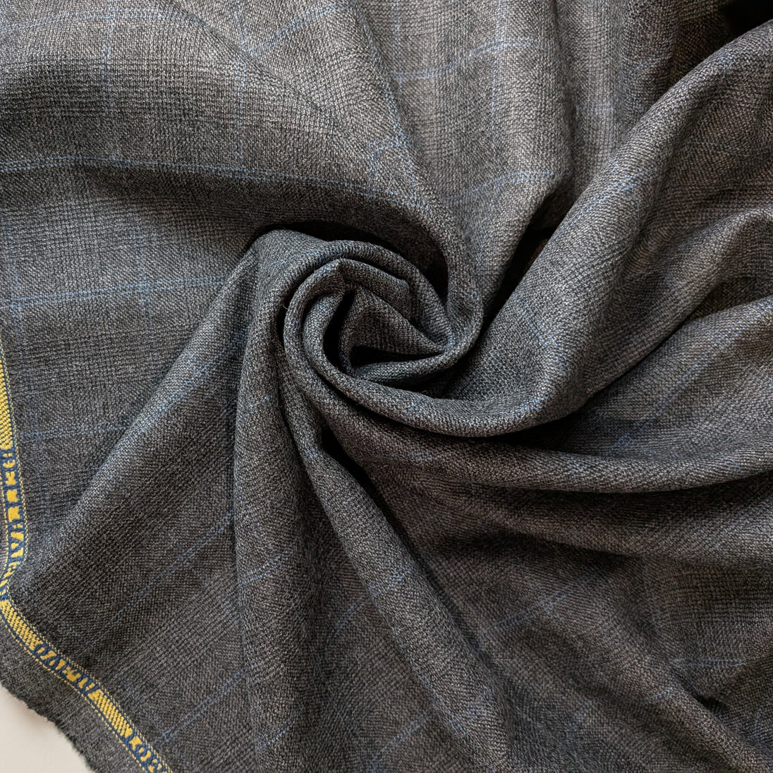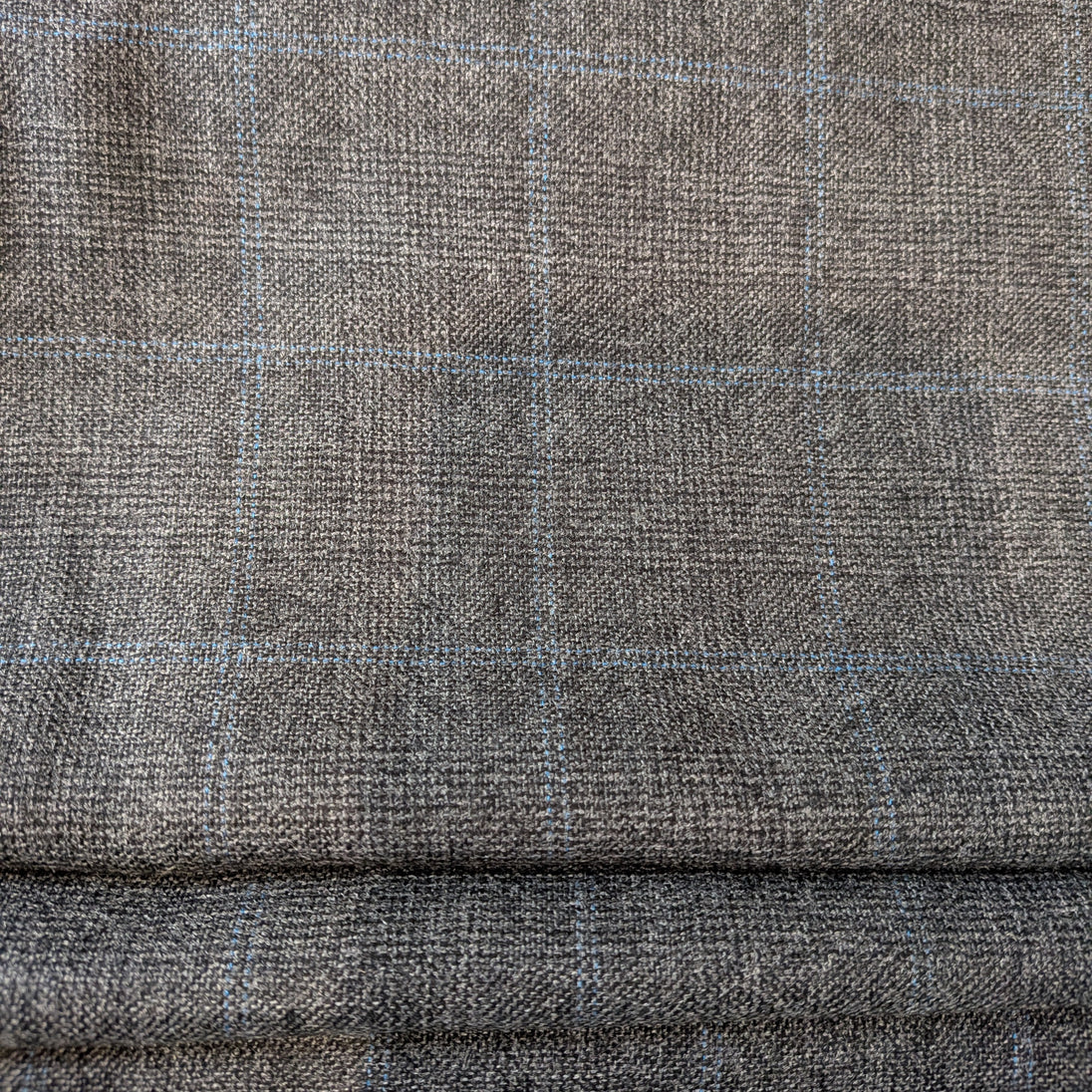 The plaid is composed of gray woven with lines of blue thread in an open windowpane plaid contrasting beautifully against the woven background, creating a subtle pattern. This distinct design complements any decor, adding a touch of elegance and warmth to your home or wardrobe.