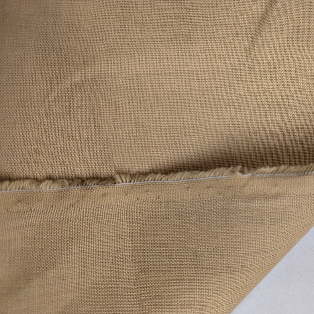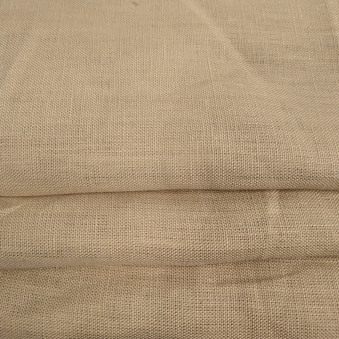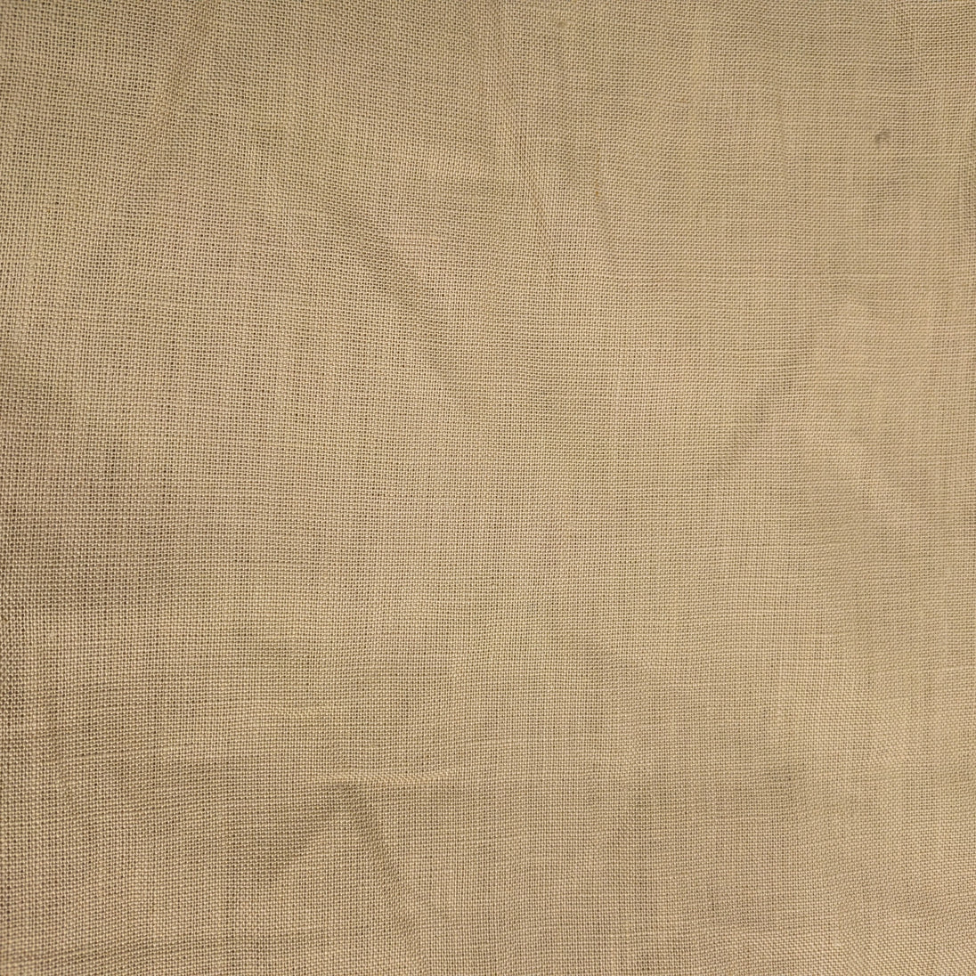 All natural 100% linen, tightly woven with high thread count. It is a light tan color. This is a medium weight material softening after each wash.