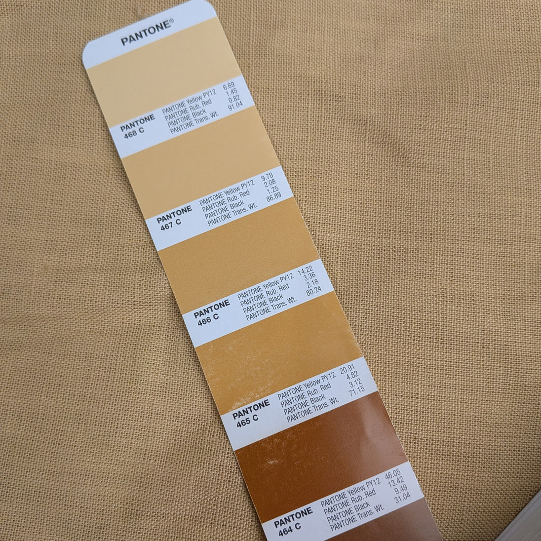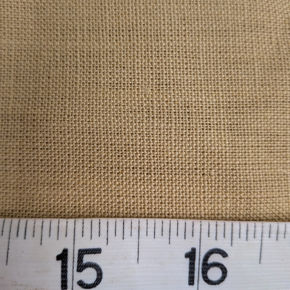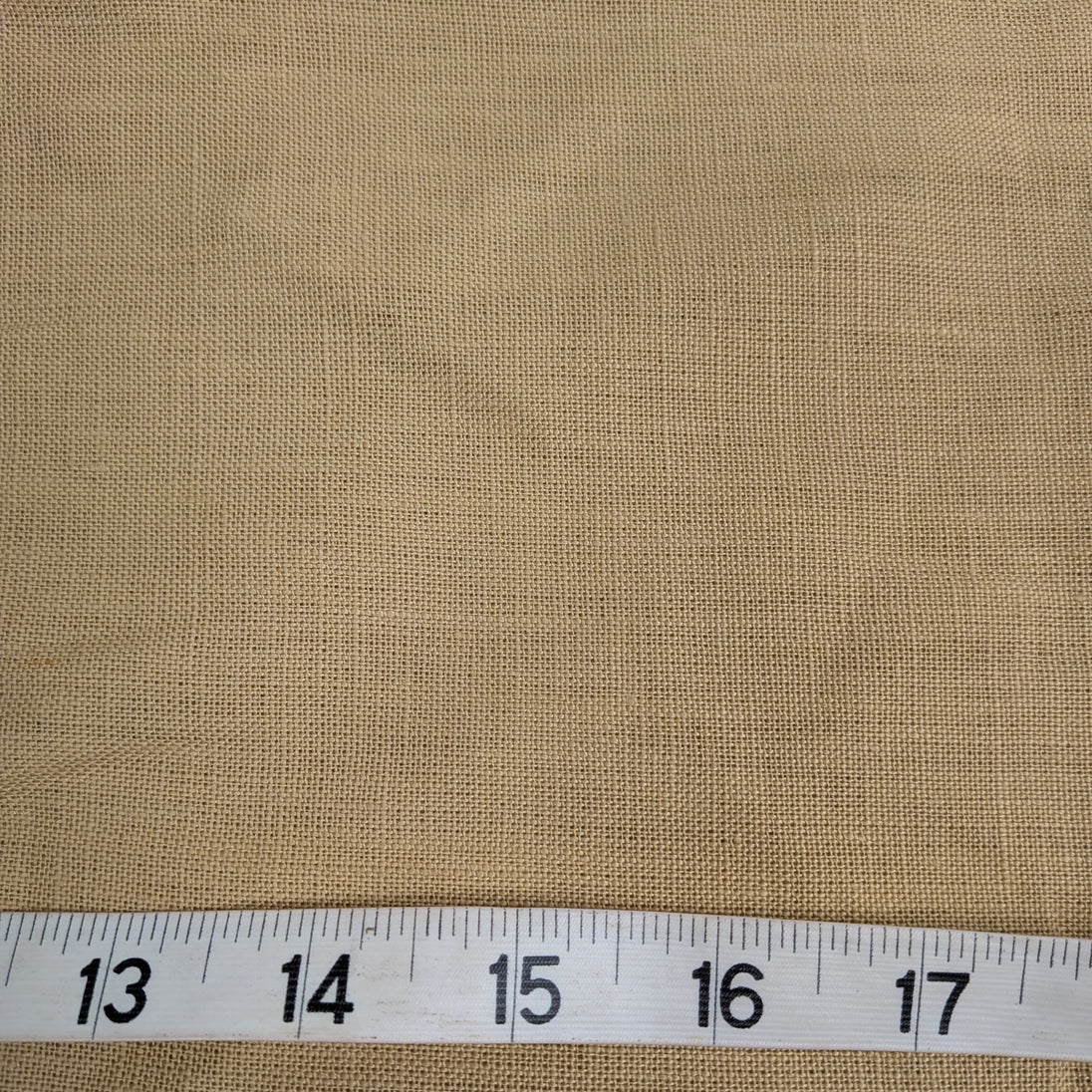 All natural 100% linen, tightly woven with high thread count. It is a light tan color. This is a medium weight material softening after each wash.