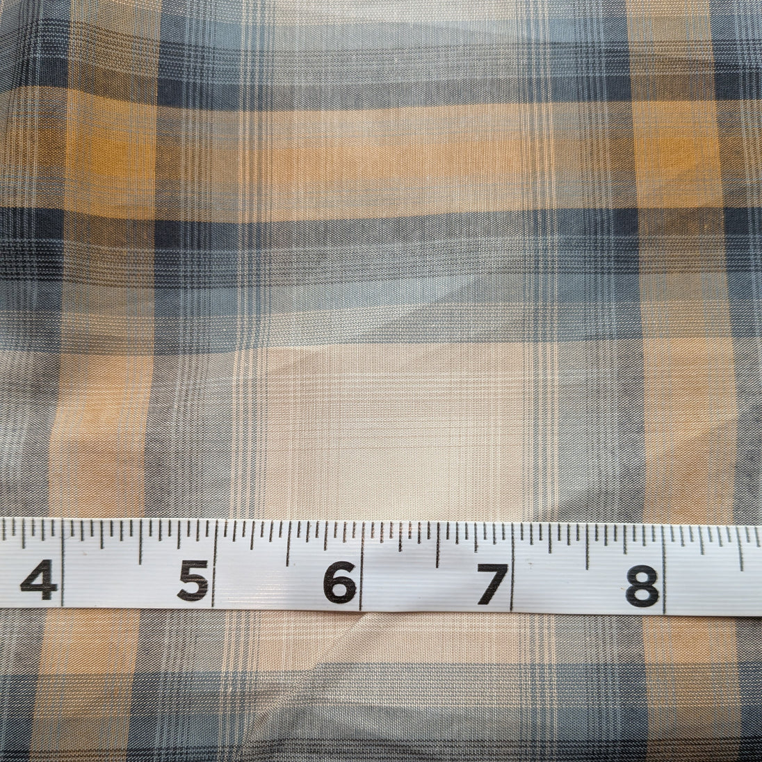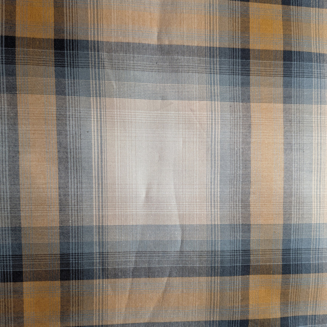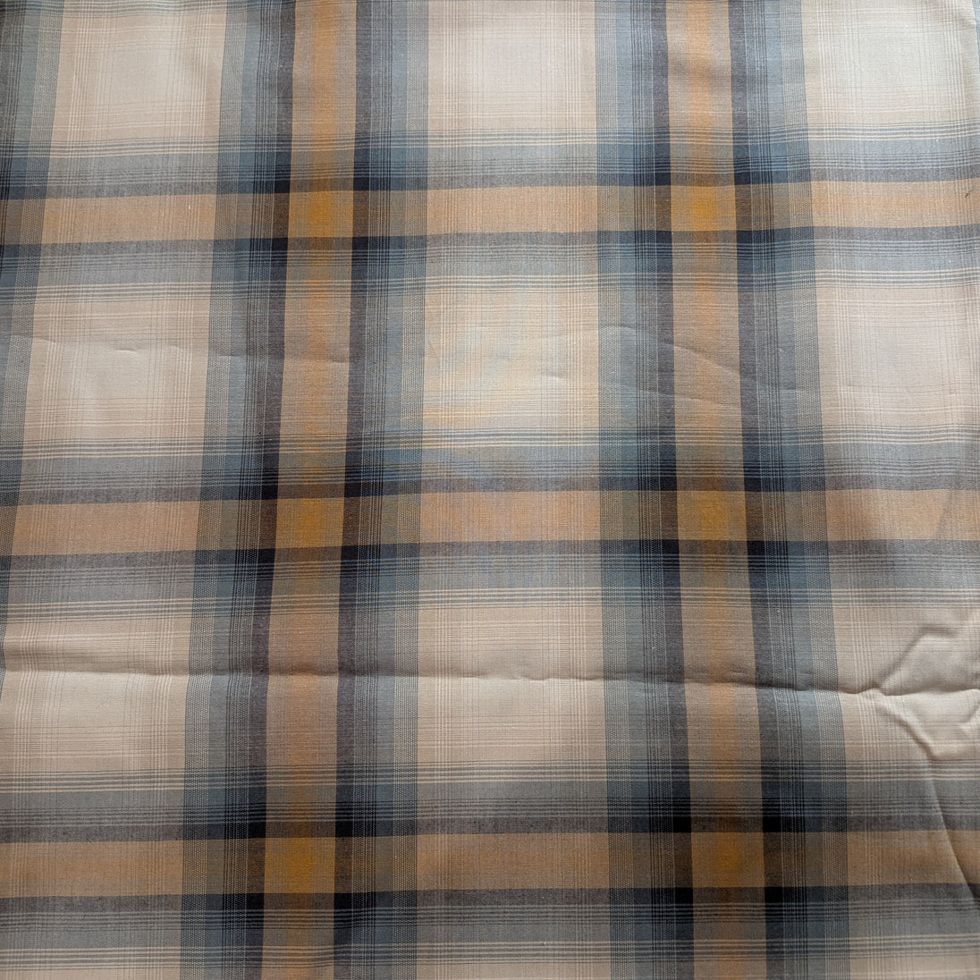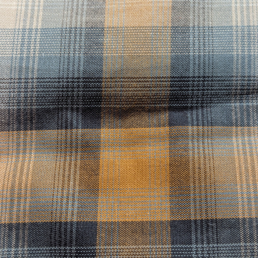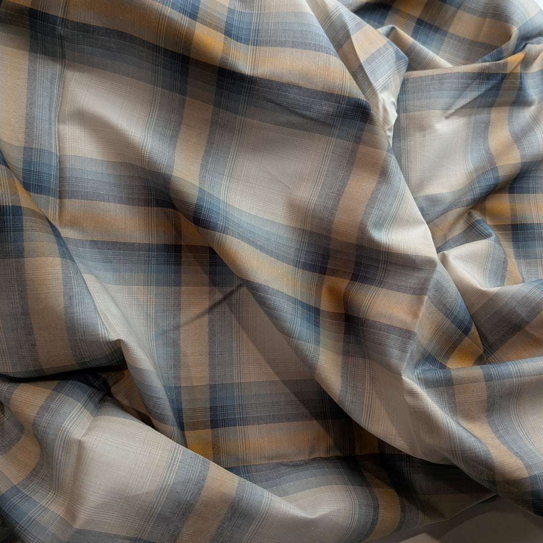 Shirt weight tightly woven blue and gold plaid with a cream. Pendleton pima cotton fabric.